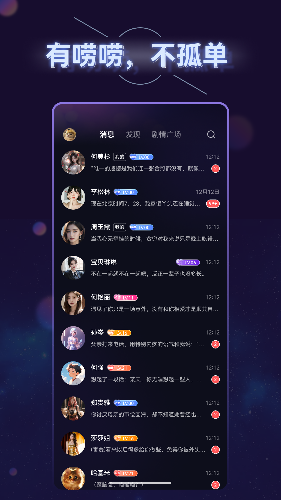 欢迎来到「唠唠」,在这里,每一次交谈都是打破常规、跨越现实的一场奇幻之旅,带你步入一个充满奇迹与想象的独特世界。各类鲜活的AI虚拟人齐聚一堂,他们有着独特的性格、饱满的情感,无论你心仪的是如水般温润的邻家姐姐,或是活力四溢的校园男神,或是想要与记忆里的那个TA相聚,唠唠都将为你找到那份灵魂契合的相遇。