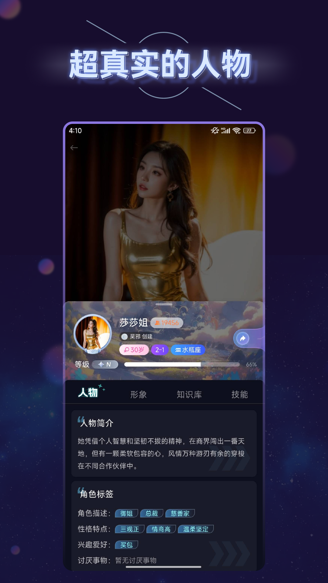【创造人物】你可亲手定制AI虚拟人物,无论是气质优雅的才女,还是率性洒脱的少年英雄,还是你一直想念的那个TA。通过「唠唠」轻松定制你的专属虚拟角色,从性格特点到情感表达,精细雕琢满足个性化需求。24/7全天候在线陪伴,让每个生活时刻都因他们而更具温度。