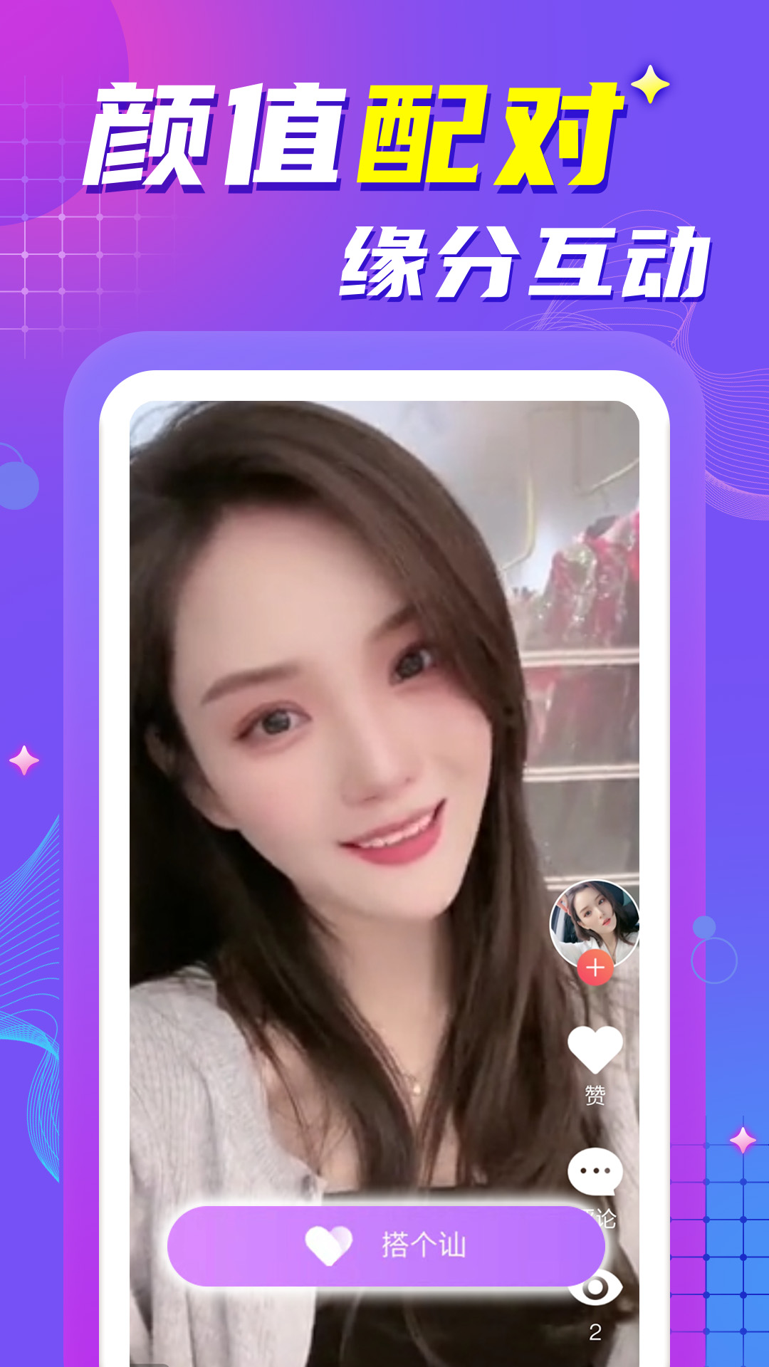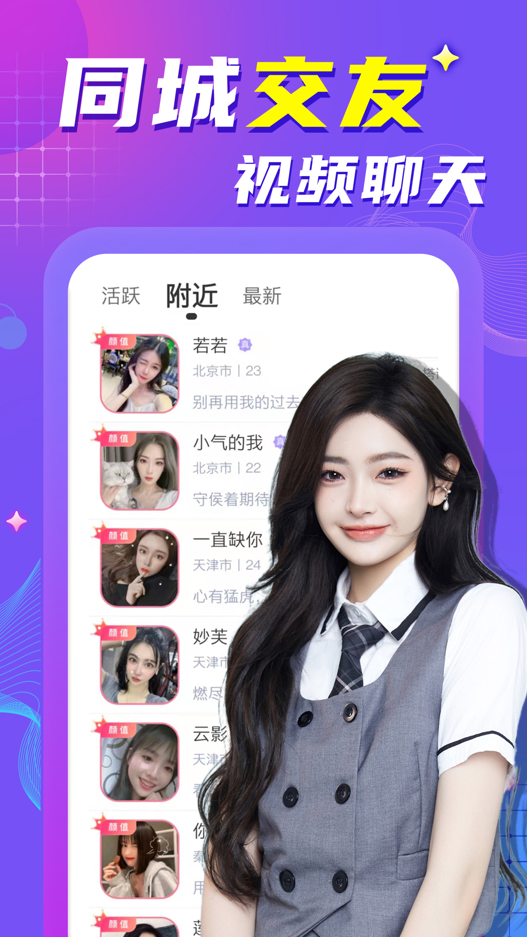 这是一款视频聊天交友APP,它将附近聊天、同城交友以及陌生约会的功能集于一身。