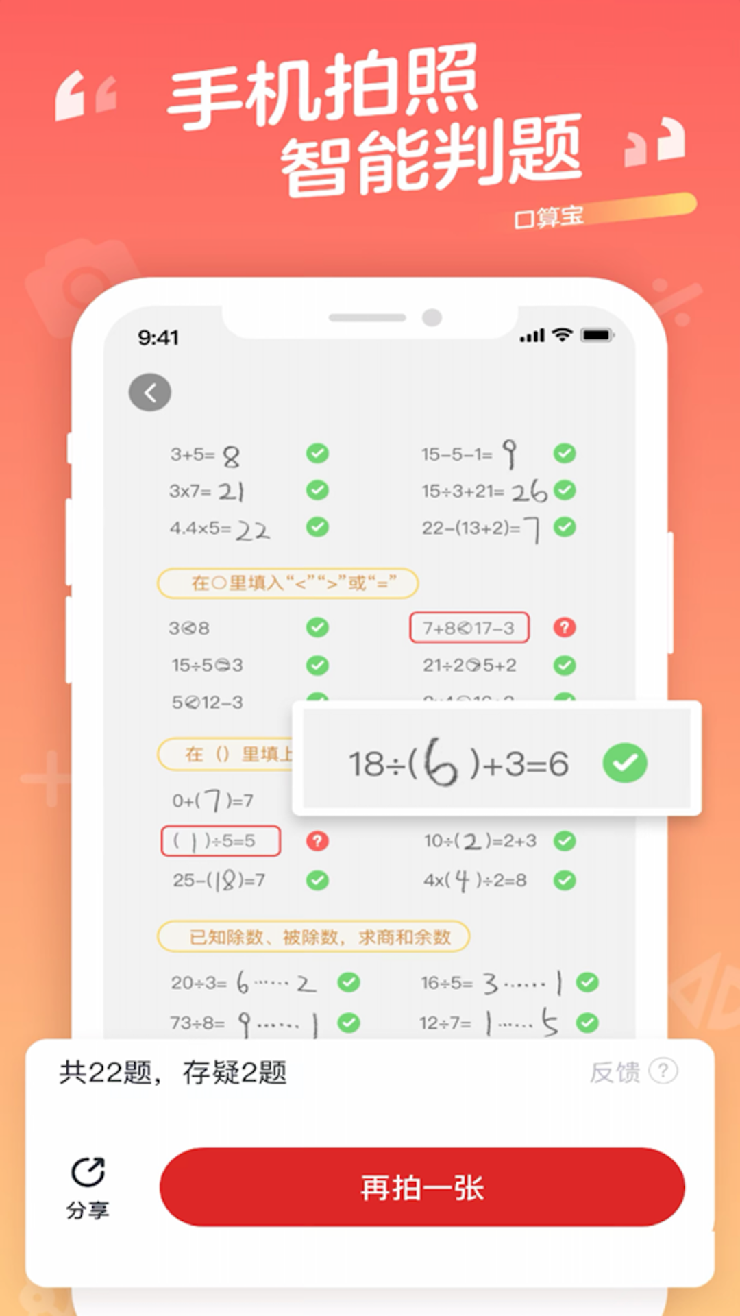 ◤手机拍照,智能判题:只需轻松一拍,口算检查的问题就能全部解决。