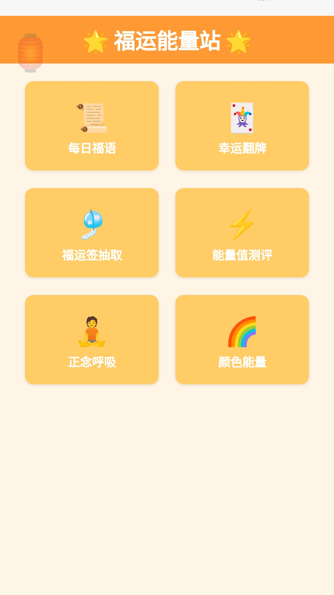福运能量站是一款充满正能量的互动应用,旨在为用户带来好运、幸福和积极的生活态度。通过每日福语、幸运翻牌、福运签抽取等趣味功能,用户可以获得鼓舞和激励。应用还提供能量值测评、正念呼吸练习等实用工具,帮助用户提升生活质量。无论是寻求灵感、放松心情,还是设定目标,福运能量站都能为您的日常生活增添一份祥和与欢乐,快来下载体验吧~