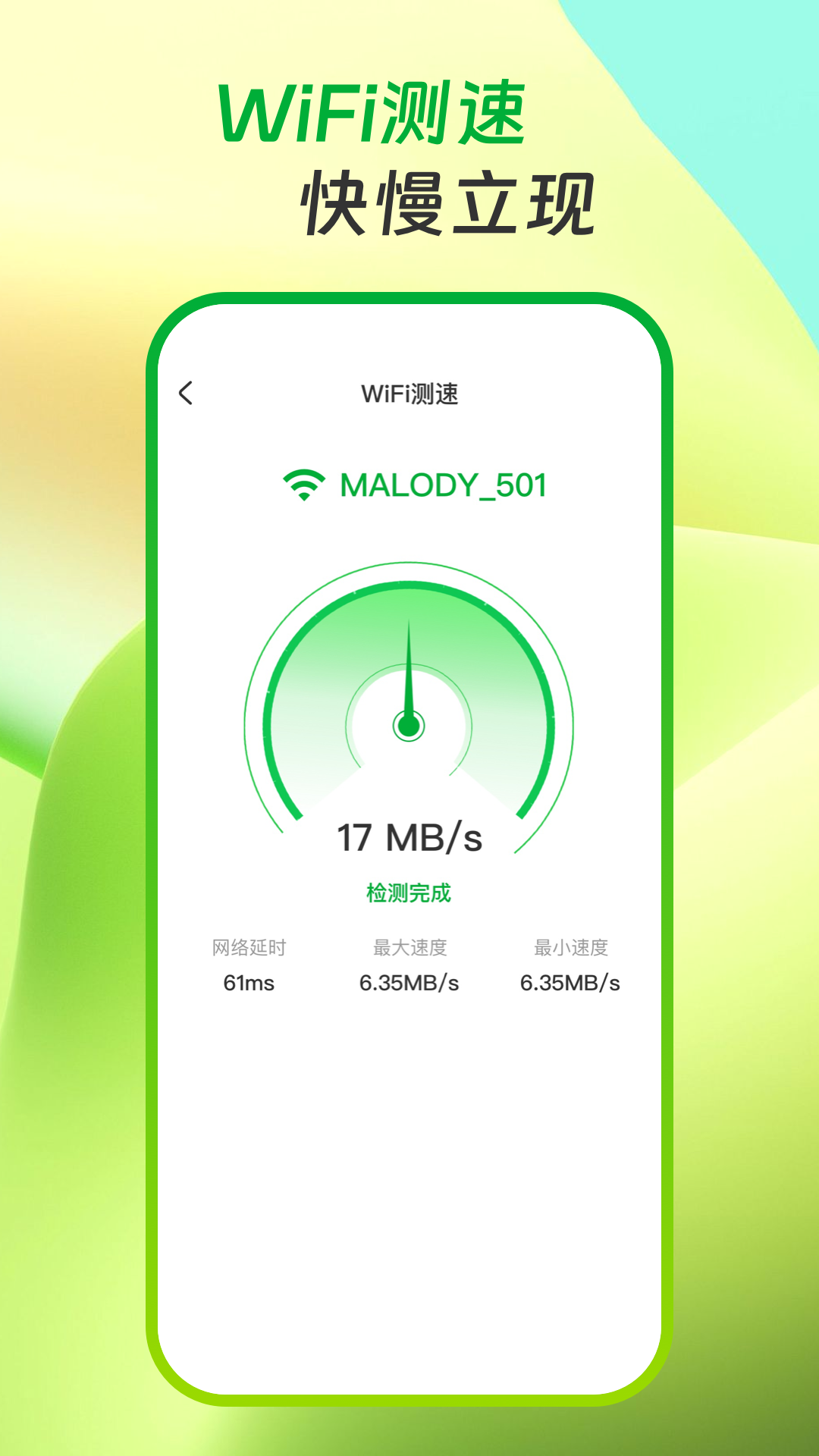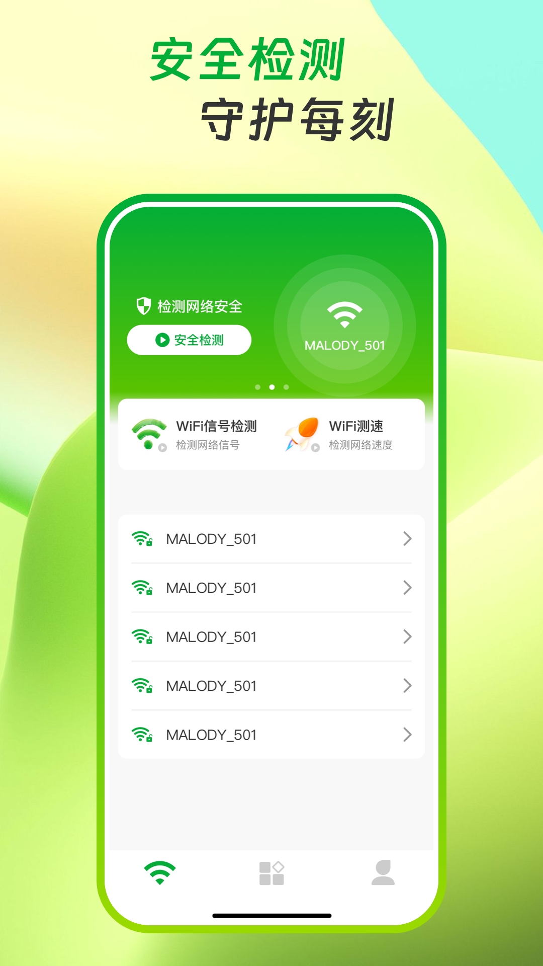 首页包含安全检测、网络保镖、网络诊断、WiFi信号检测、WiFi测速和WiFi列表的功能,用户可在当前页面,测试已连接的WiFi的安全性和速度。