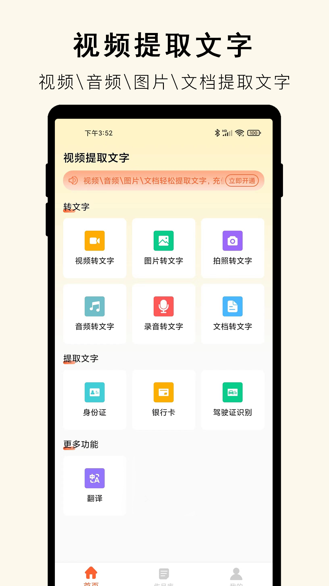 这里有着丰富多样的功能,像视频转文字、图片转文字、拍照转文字、音频转文字、录音转文字、文档转文字,还有身份证识别、银行卡识别、驾驶证识别、翻译以及文字转语音等功能。