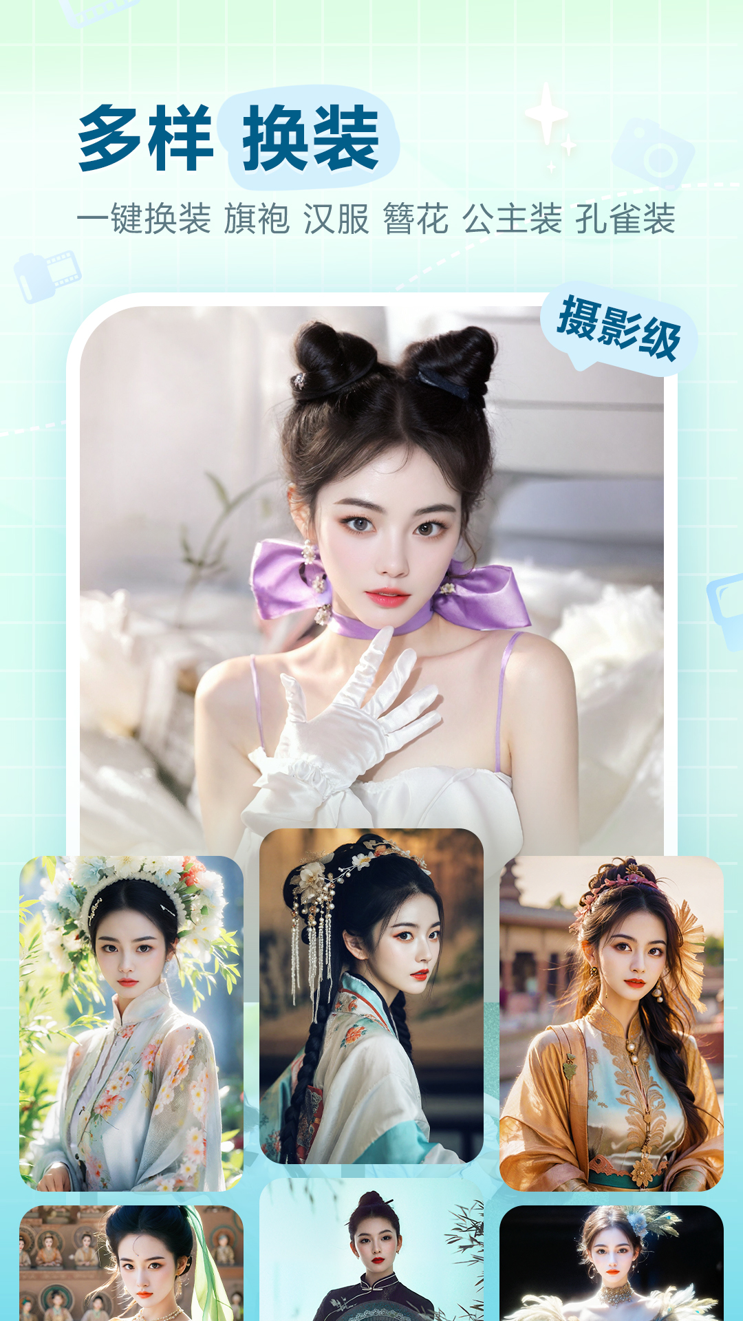 一键生成您的旗袍、汉服、婚纱、礼服、民族服等换装照片,可温婉、可酷飒、可气质,看看不一样的自己。