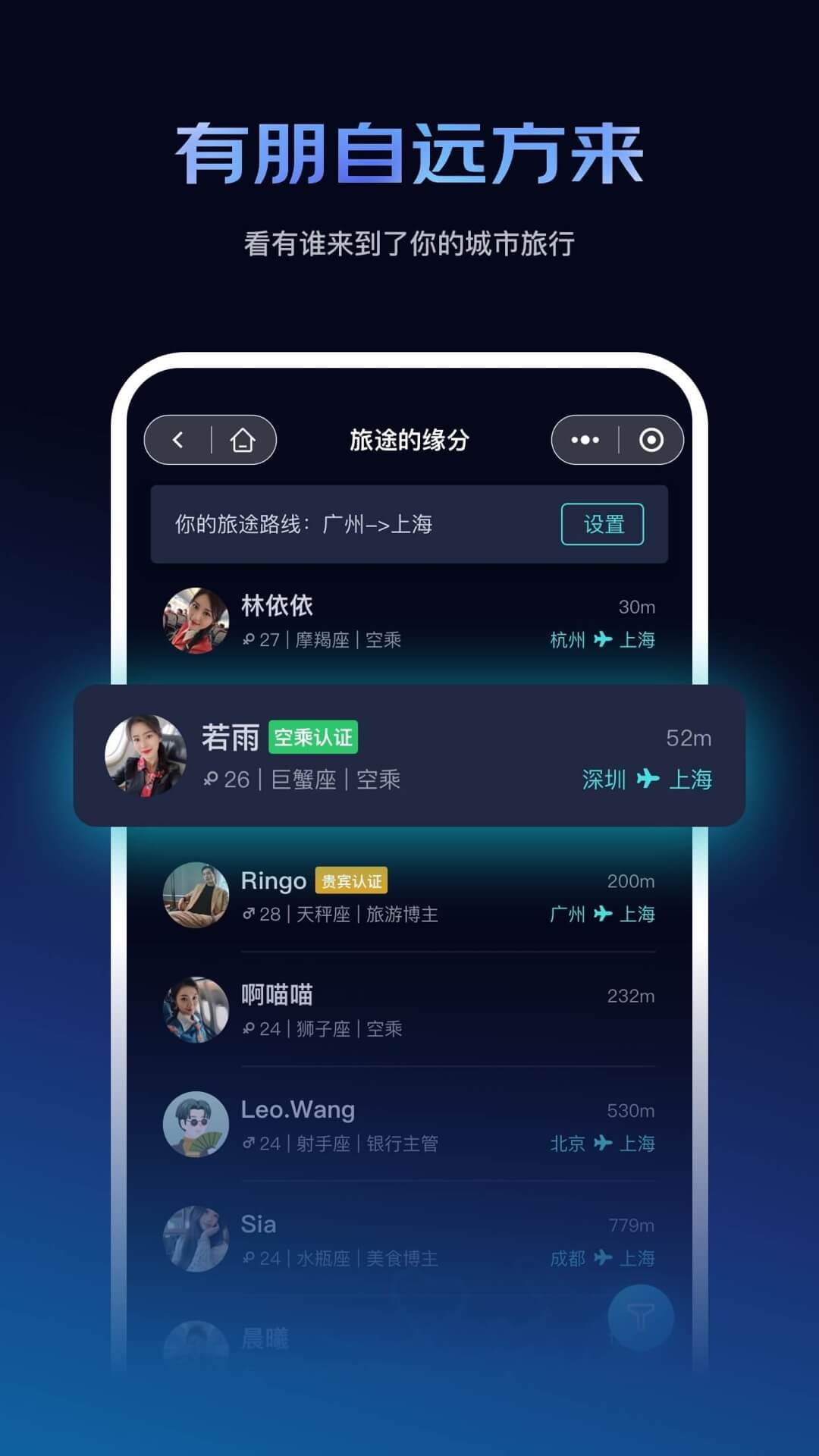 没错,我明白大家在玩其他社交软件的时候费尽周折聊天,最终也不过是想要添加微信罢了。所以,我们只专注于助力大家发现旅途中的缘分。这里没有聊天功能(毕竟大家都不想手机里有过多的聊天软件),如果看对眼了就直接加微信,之后的故事就在微信里续写吧!