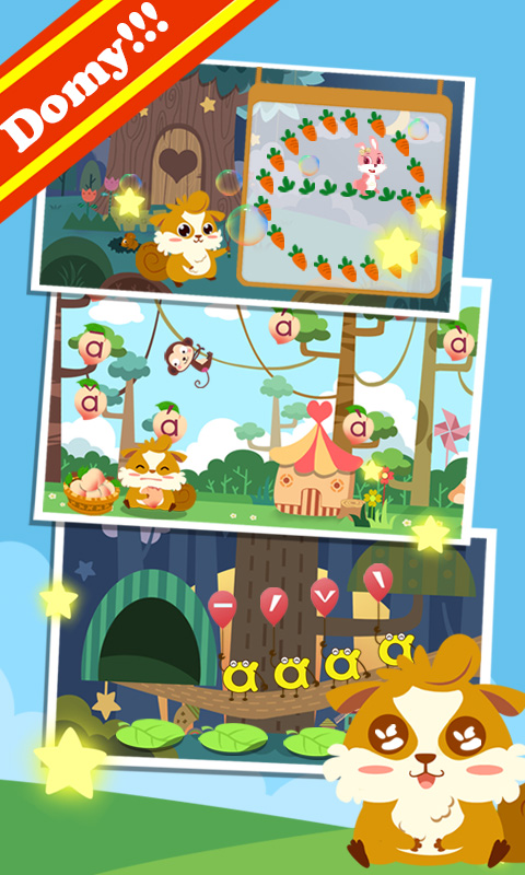 -摘桃子:主角多米与猴子的互动加上小朋友一起的帮助,摘更多的桃子同时有加深了对字母的认识度!