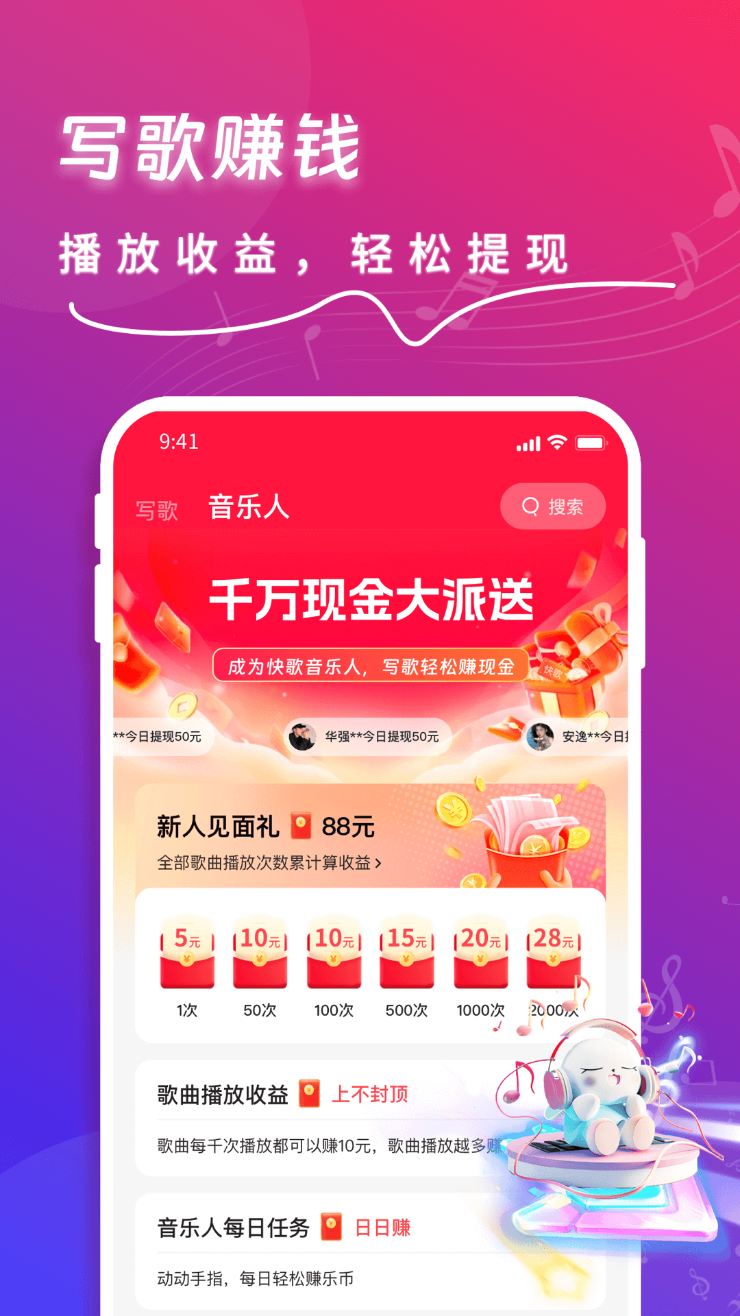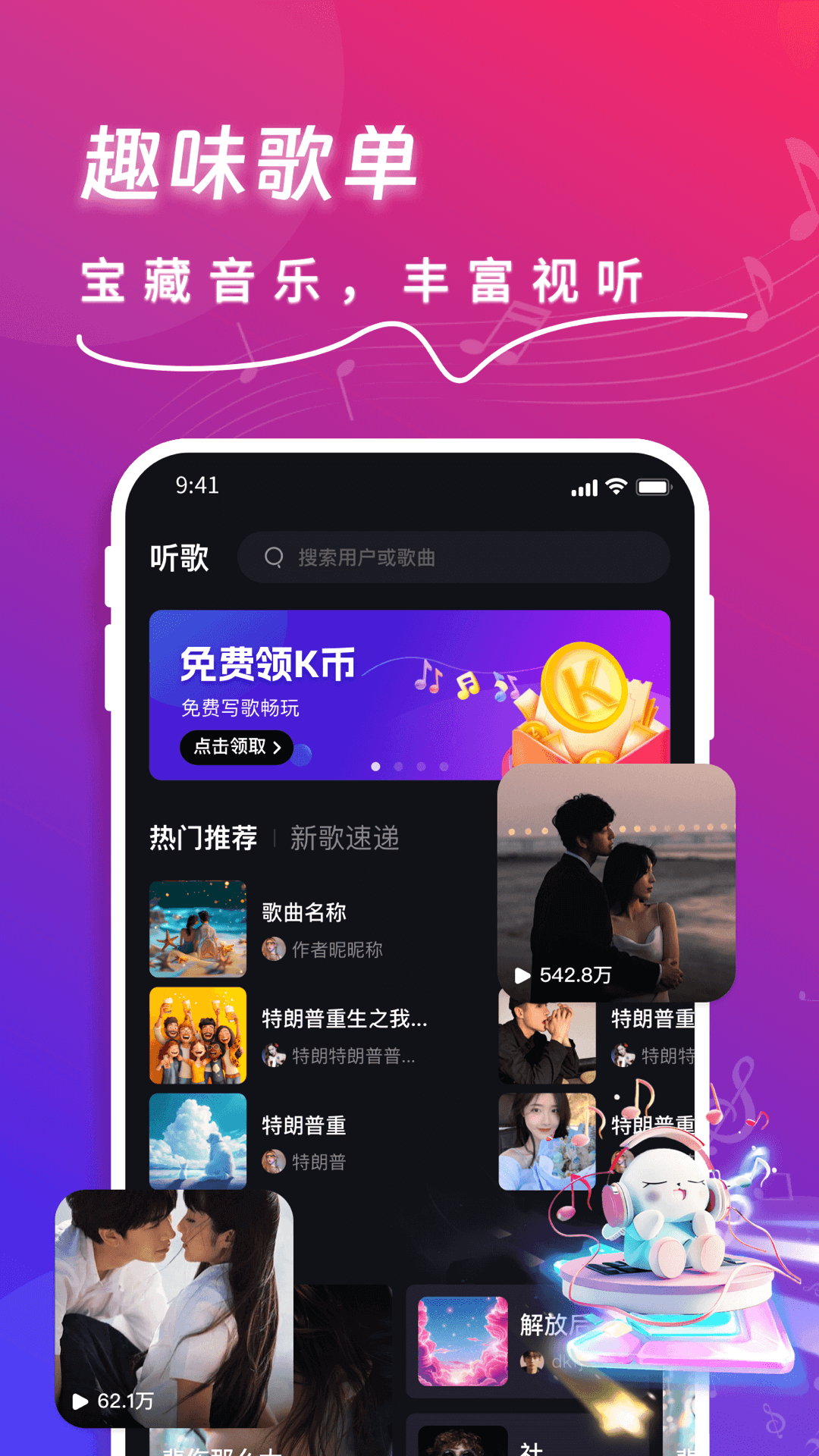 1.每日K币任务新增新人专属福利; 2.音乐人播放收益支持查看歌曲历史累计收益; 3.修复BUG,优化产品使用体验。