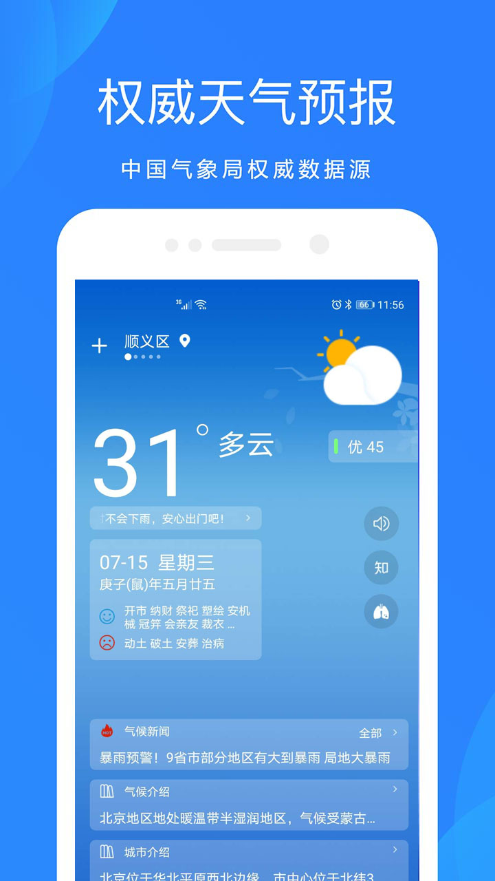 【语音播报】功能由甜美的女声为您播报当前天气情况以及需要注意的事项,方便您在忙碌或者不方便查看手机屏幕的时候也能获取天气资讯。