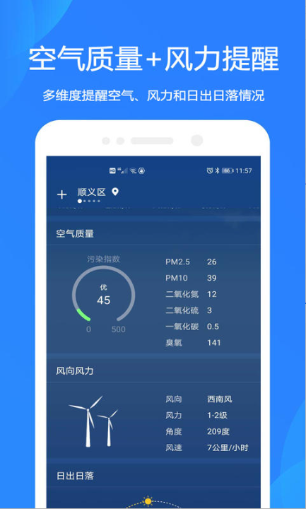 【实时天气信息】能实时获取您所在当前位置的天气预报,同时提供空气质量污染指数,使您随时掌握身边的天气与环境情况。