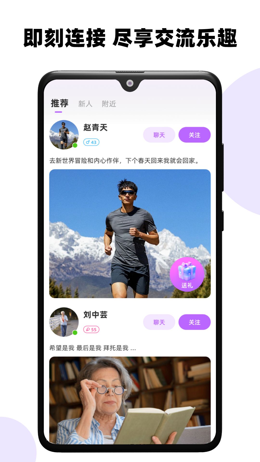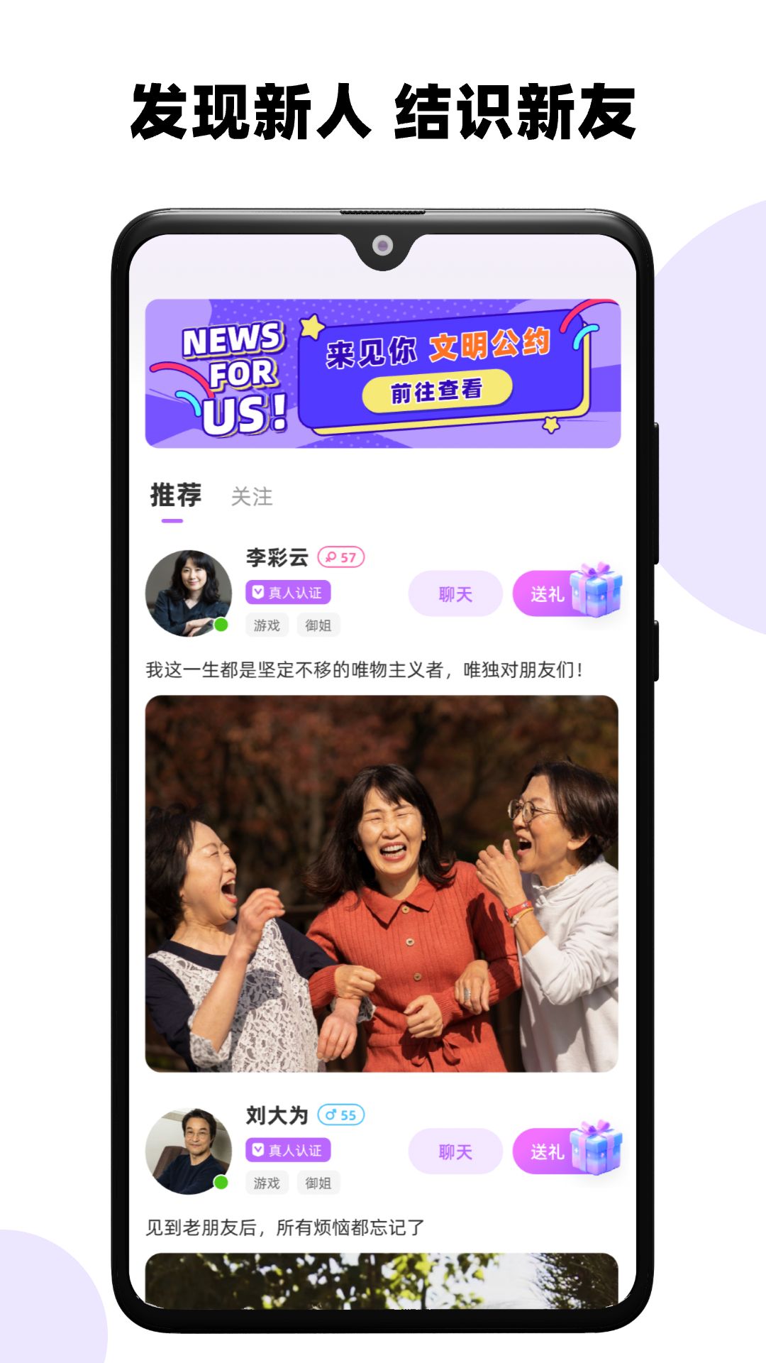 “来见你”APP,是一款精心为中老年人定制的交友与娱乐平台,能让您的夕阳时光绽放出更绚烂的光彩。