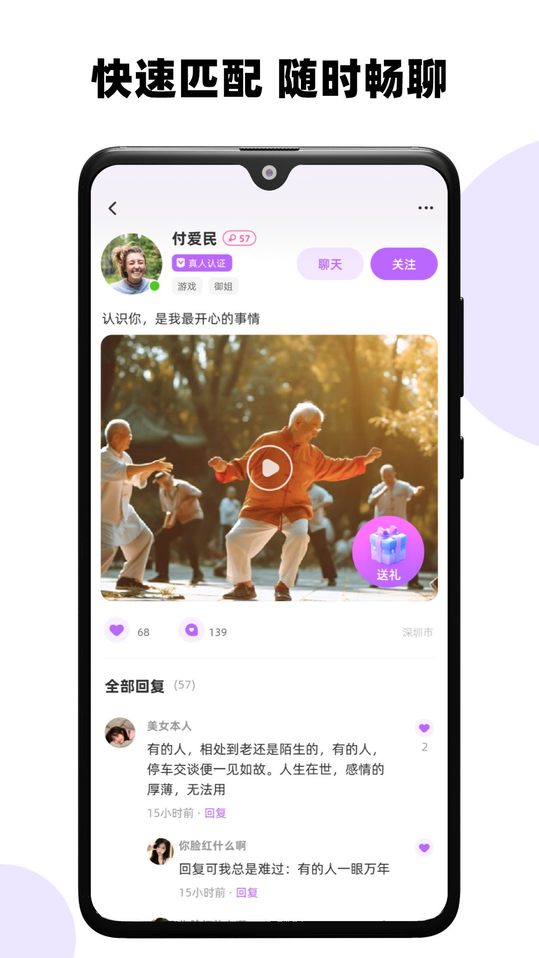 在这个平台上,交友变得轻松简单。不管您是想在同城寻找好友,还是渴望邂逅有缘的灵魂伴侣,我们都会全力以赴助力您达成心愿。我们的聊天功能就如同您专属的私人树洞,真人一对一的闲聊模式,能让您在任何时候都可以向知音尽情倾诉内心的想法,分享生活中的酸甜苦辣。无论是家长里短的琐碎之事,还是心底深处不为人知的秘密,这里都将是您最安心、最可靠的倾诉之处。要是您有再婚或者离异征婚的想法,同样能在这里找到理解您、懂您的人。