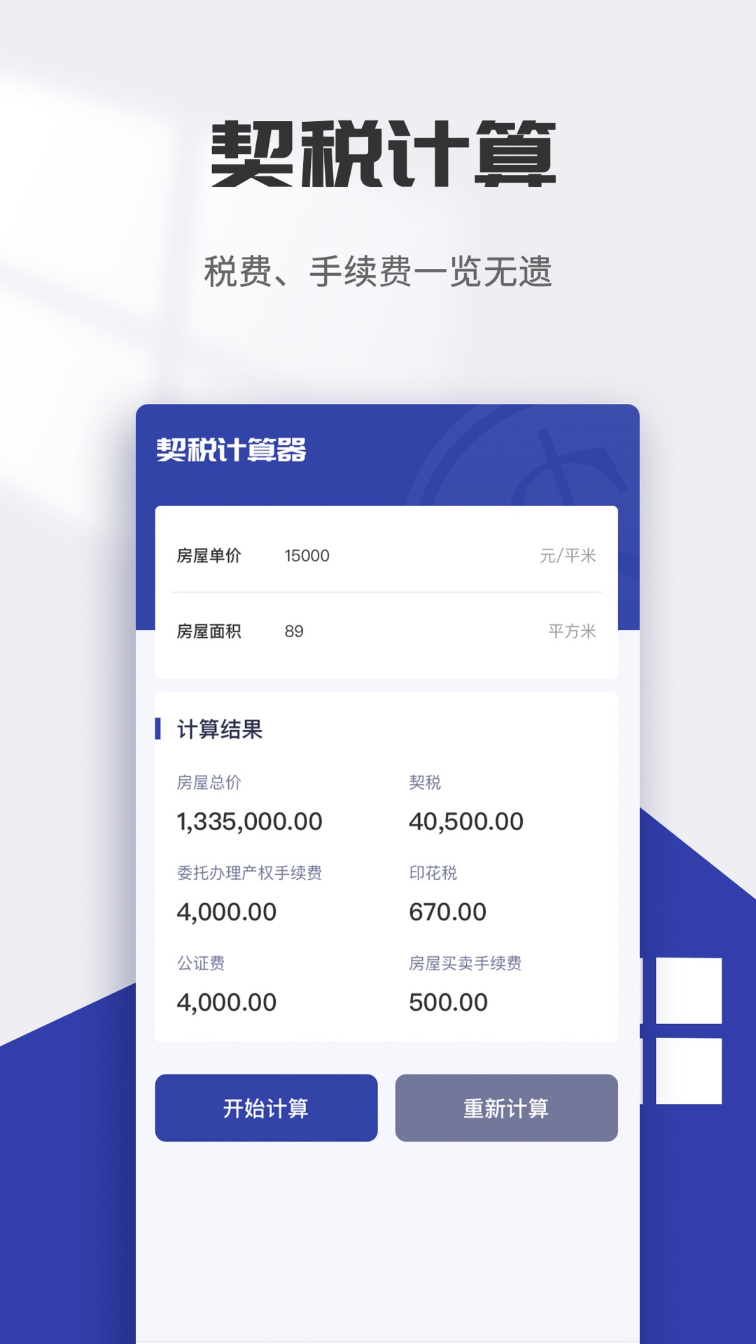2. 契税计算:用户输入房屋购买价格和所在地区,即可获取契税的详细计算结果。