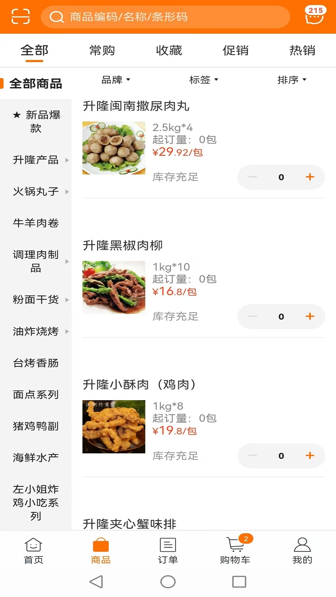 江洲行商贸的实际功能是进行线上下单,购买商品,主要用于火锅、麻辣烫、烧烤等。产品种类齐全,质量放心,包含各种丸子、串串、肉类、粉面等。产品页面分类清晰,价格明确,订单处理迅速,配送到家,全方位服务,提供方便便捷的订货方式。