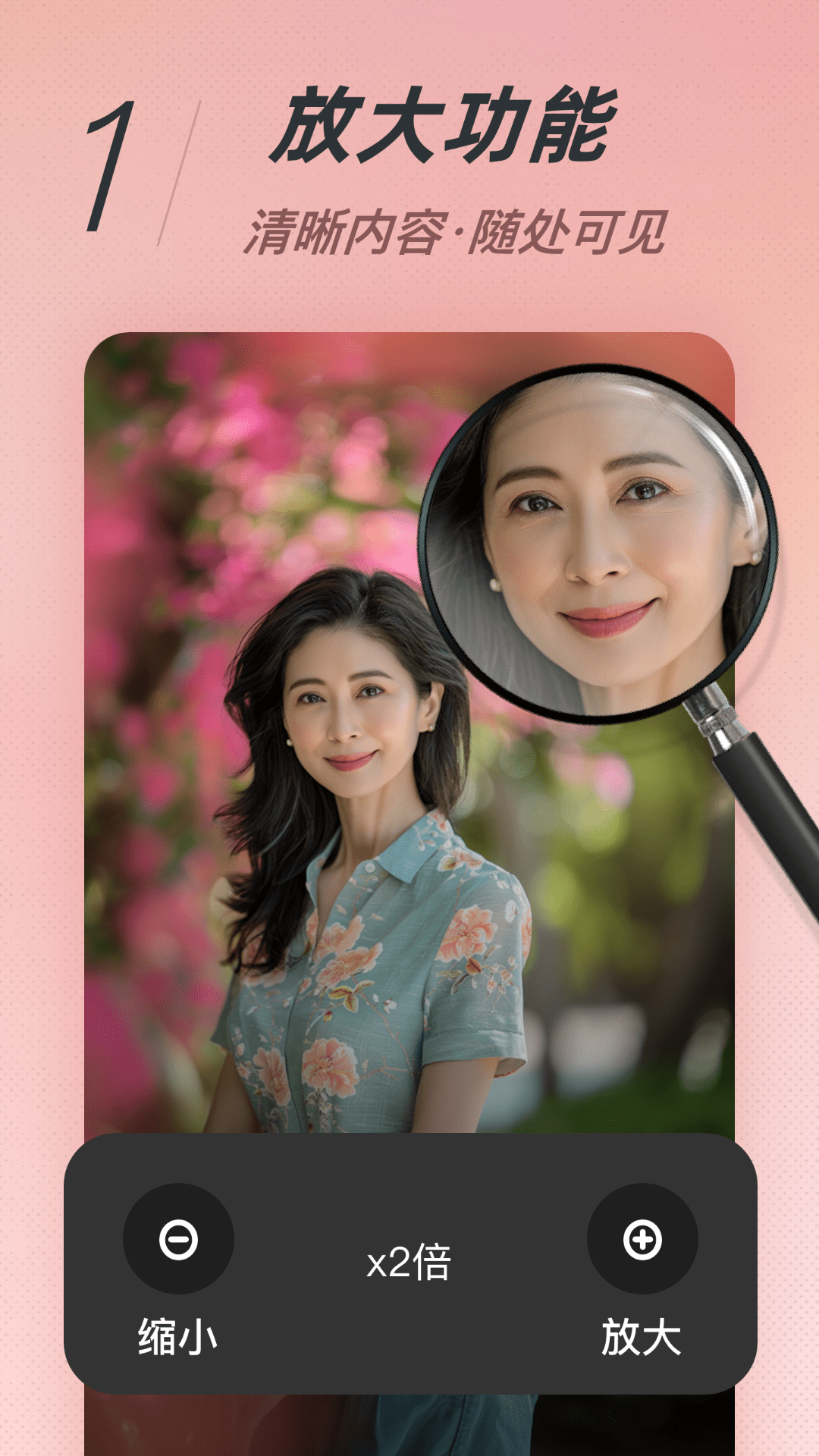 青春放大镜主要是为解决老年人老花眼困扰而设计的。它能够借助相机来放大字体,便于老年人阅读查看。除此之外,这款放大镜还配备了手电筒、血压仪等对老年人来说非常实用的工具,使用起来更加方便、简洁。青春放大镜可不单单是一个普通的工具,它更像是老年人生活中的贴心伙伴,借助科技的力量,助力老年人更好地去享受生活,维持活力并保持生活的独立性。