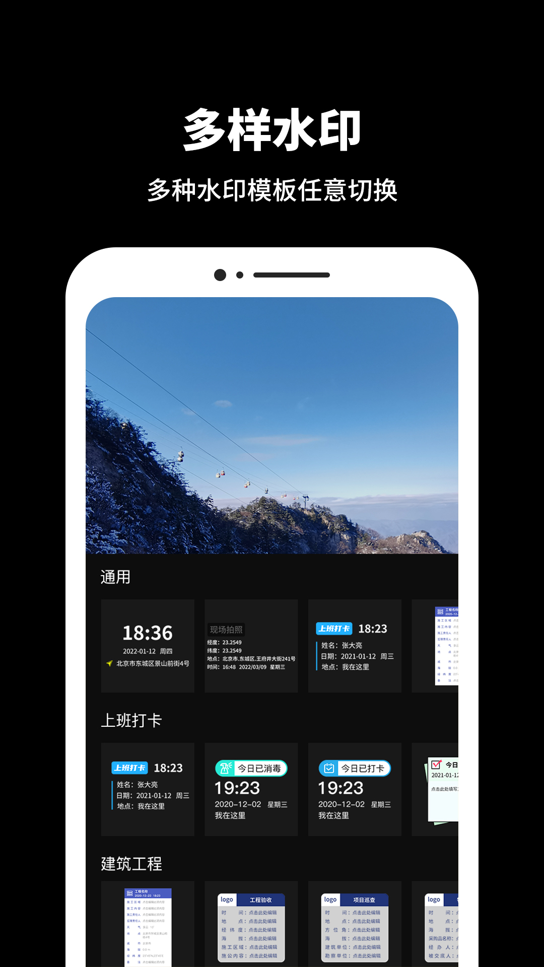 经纬相机是一款专门用于工作拍照的水印相机。它提供了丰富多样的水印贴纸供您选择,像是时间地点水印、工程水印、天气水印、工作打卡水印等等。