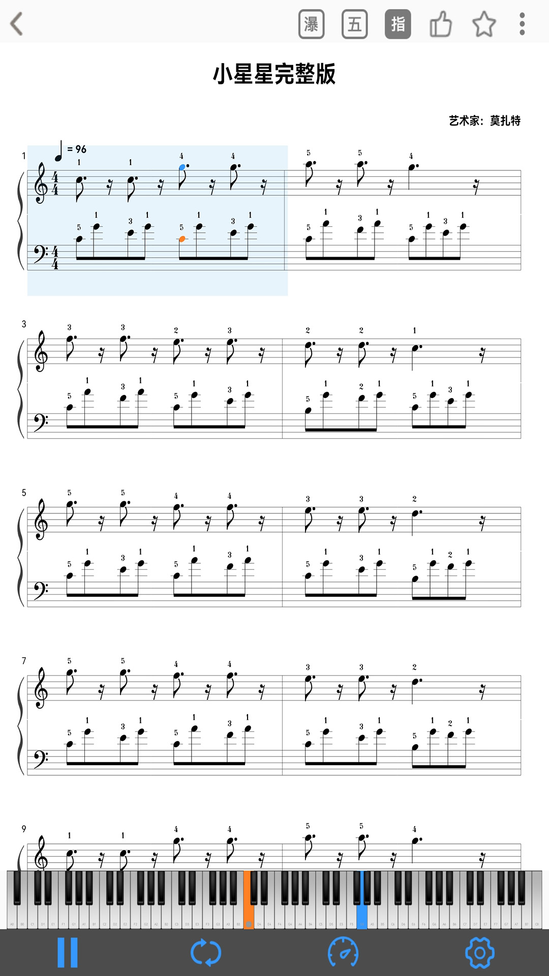 - 所有曲谱都能播放,您可以设置播放位置、让曲谱循环播放、调整播放速度、查看瀑布流,还能调整音轨。