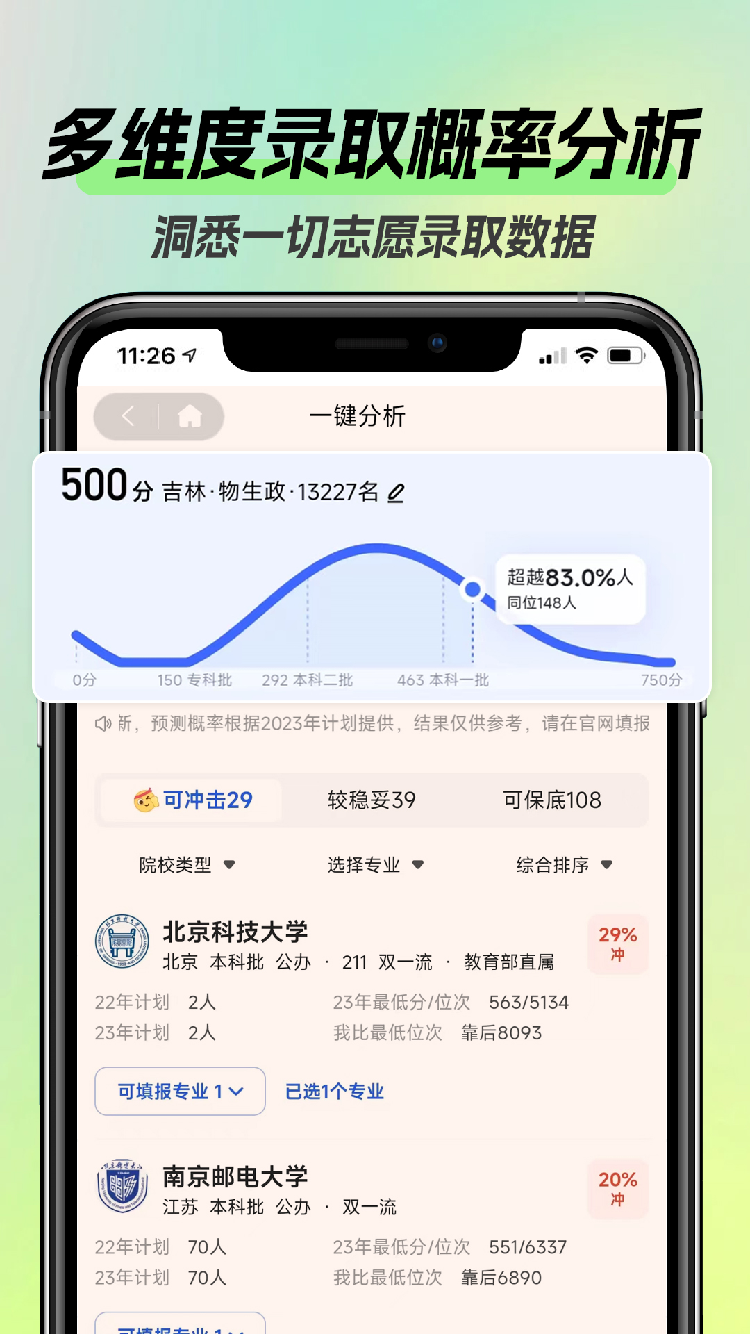 启航志愿依托智能AI算法,能够精确匹配院校、省份、地区等各类信息变量。它以更快捷的方式对报考数据进行整合,从而协助考生用户规划出冲、稳、保的梯度填报顺序,有效降低填报风险,实现科学填报志愿。