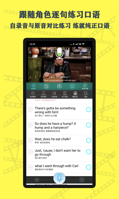 2、跟随角色逐句进行口语练习,自录音与影视原音对比练习,练就纯正口语。