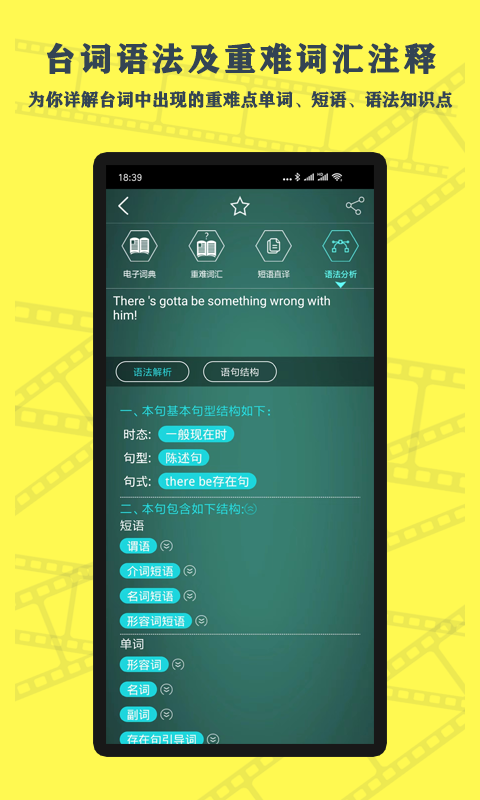 3、一键查询台词中的单词、短语、重难单词短语讲解、语法知识点讲解。