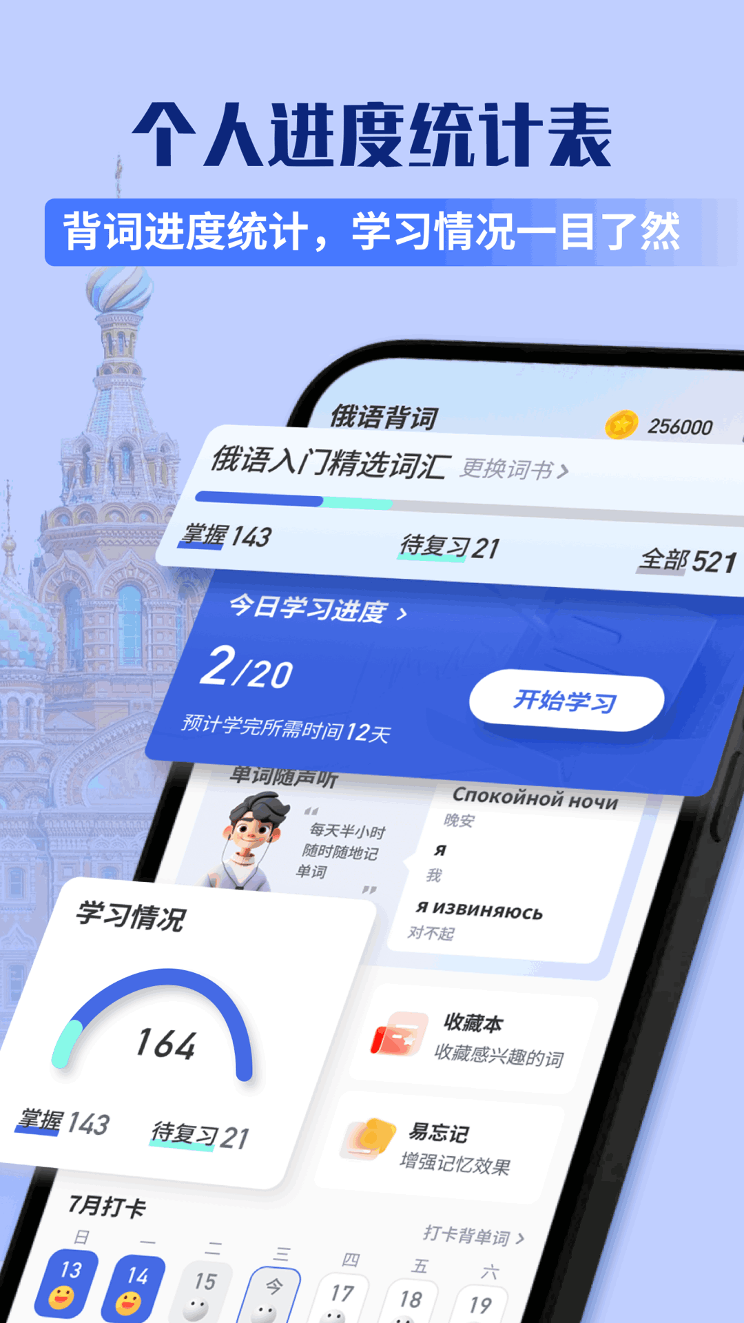 依据经典的“艾宾浩斯记忆曲线”精心打造的俄语背词复习体系,为海量俄语词汇学习进行科学规划。并且综合听、读、写等多种感官刺激,借助实际应用场景加深记忆。