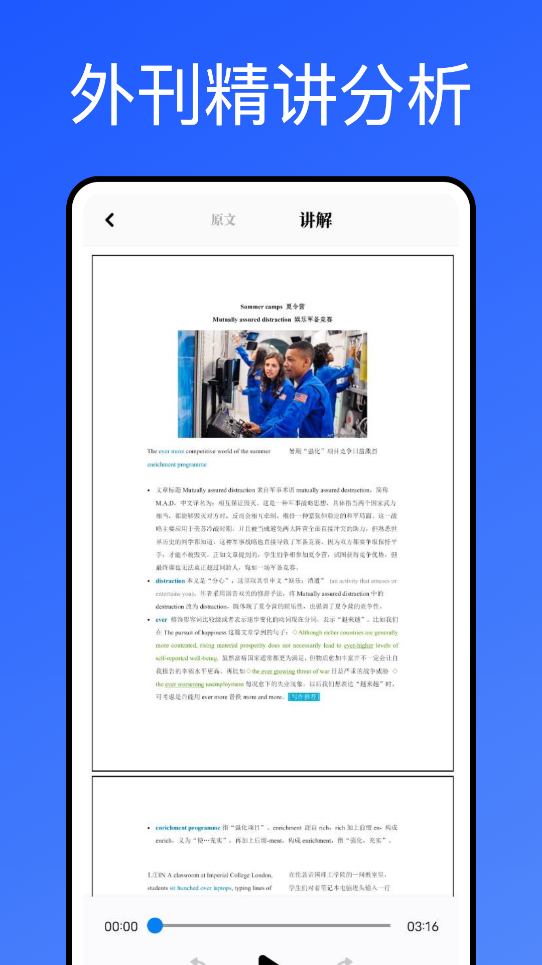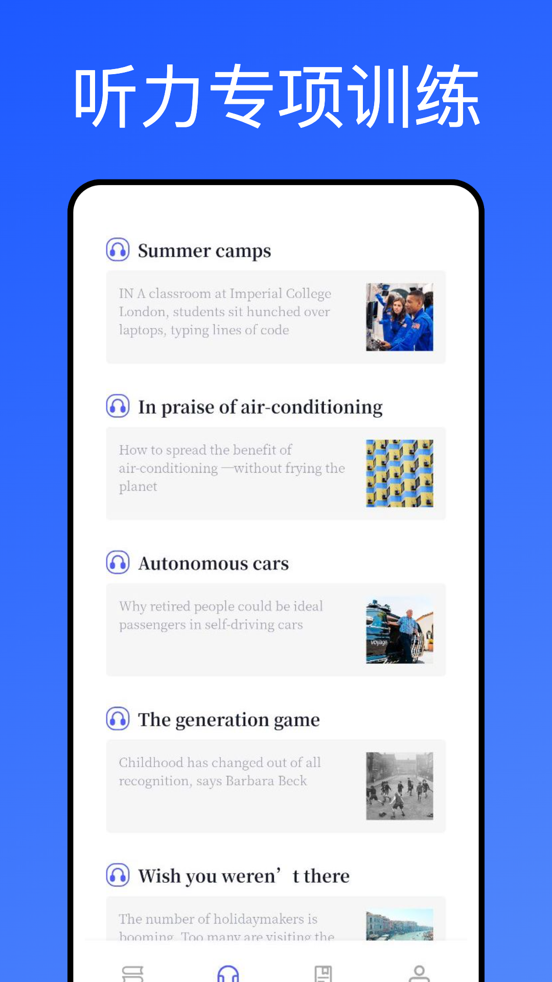 每天10分钟,英语轻松学!专为英语学习者打造的阅读、词汇、听力提升 App。每推荐精选趣味短文,外刊。更有阅读知识点讲解、生词本学习等功能。