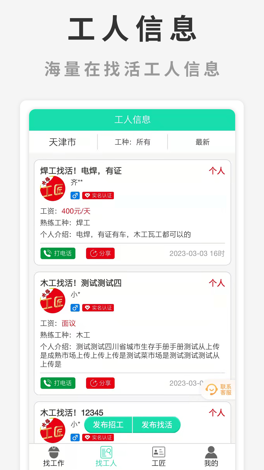 招工时,平台存有大量正在找活的工人资料,用人老板能够直接在平台上联系工人,并进行沟通以达成合作。