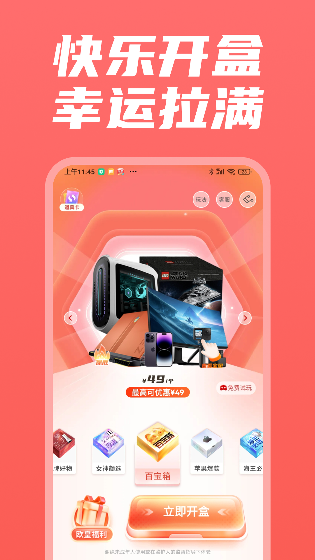 边逛边玩,惊喜开盒!其中商品价值≥开盒价,满意提货,不满意兑换~