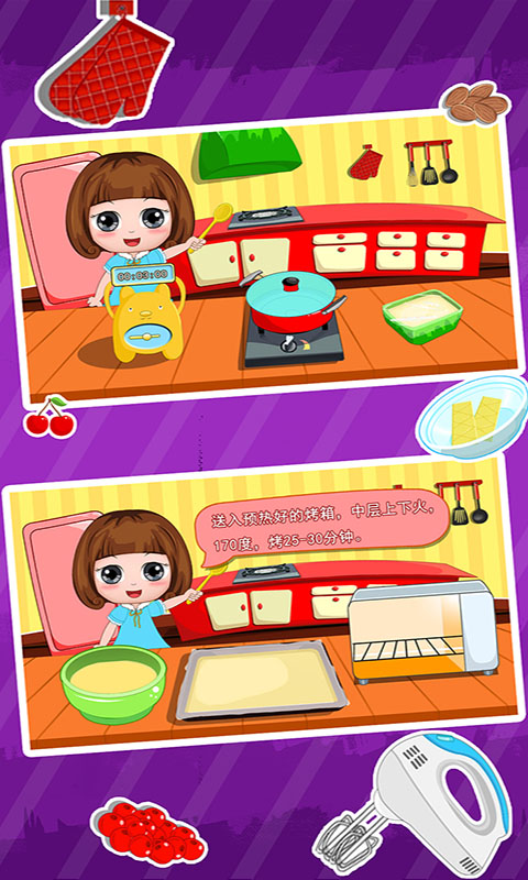 --超多食材鸡蛋、牛奶、白糖、面粉、黄油、清水、樱桃等供喜欢儿童厨房的孩子们选择