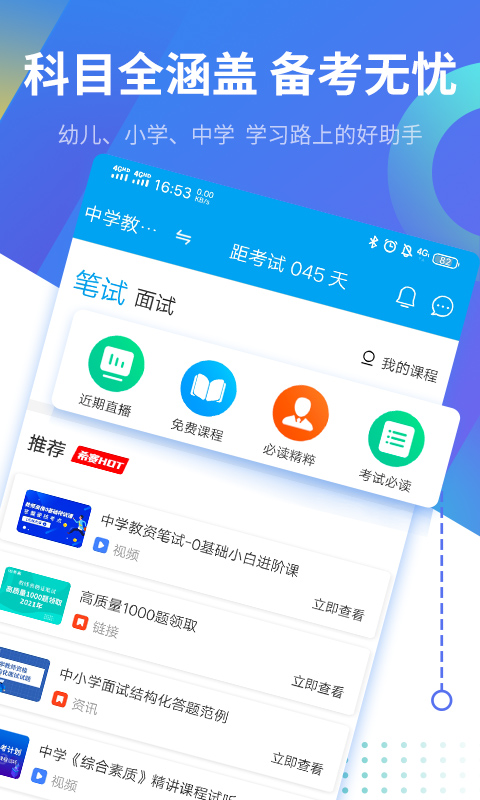 本应用集多种功能于一身,包括教师资格证考试和教师招聘考试的智能题库、视频课程、直播课堂以及学习礼包等。它能充分满足参加教师资格证考试以及教师考编人员的自学、刷题、听课等各类备考需求。让我们一起借助这个应用考教师吧,它将助力您在考试之路上轻松前行,既省时又省力,顺利拿下教师资格证!