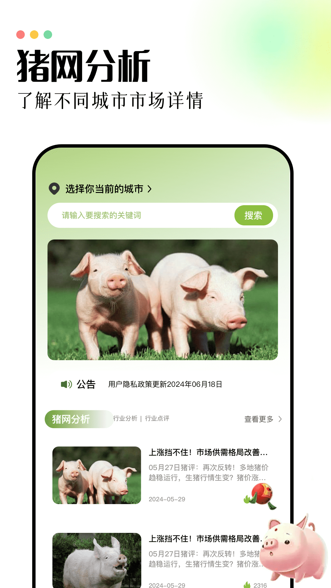 田园养猪场是一款面向养猪人士、爱好者以及对养猪感兴趣人群的app,其主要提供养猪科普知识与养猪攻略。不管你是充满创业激情的大学生,还是辛勤劳作的养殖人员,都能在这个app中体会到养猪的乐趣。