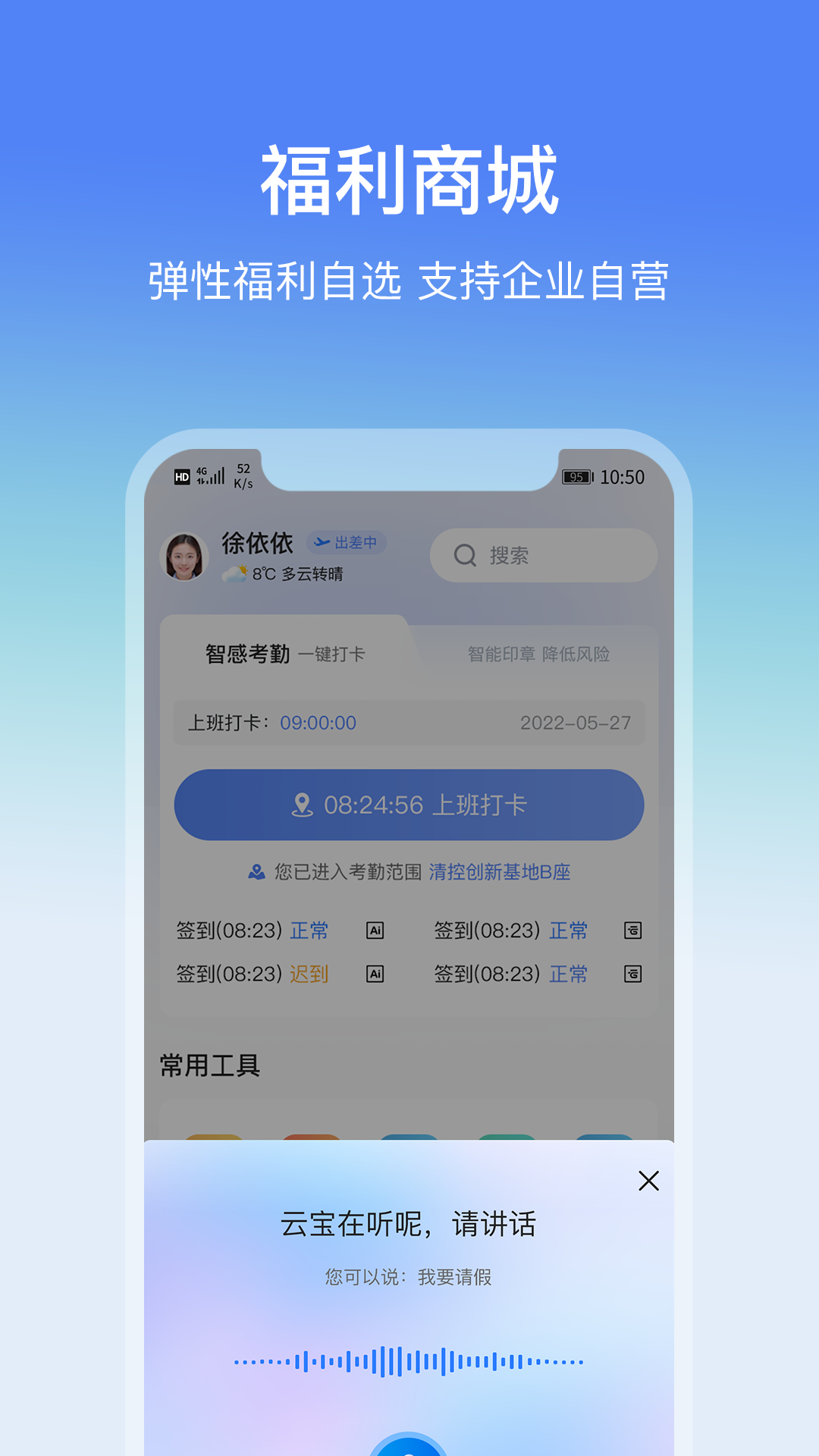 云经理借助AI人工智能、物联网、SaaS、云计算等一系列先进的互联网概念与技术,整合全方位的数字、运营、产品以及技术能力,从而为各业务逻辑提供强有力的支撑。其集成了人力资源、企业管理、个性名片、福利商城等诸多功能,拉近了企业与员工之间的距离,使工作变得更为简单高效。