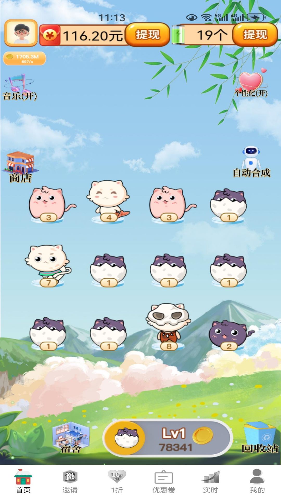 我们的猫猫共有38个等级,每两只相同等级的猫猫可以合成为一只更高等级的猫,还有机会随机获得限时金色分红猫呢!如果您能合成38级猫,就可以永久平分平台20%的广告收益。