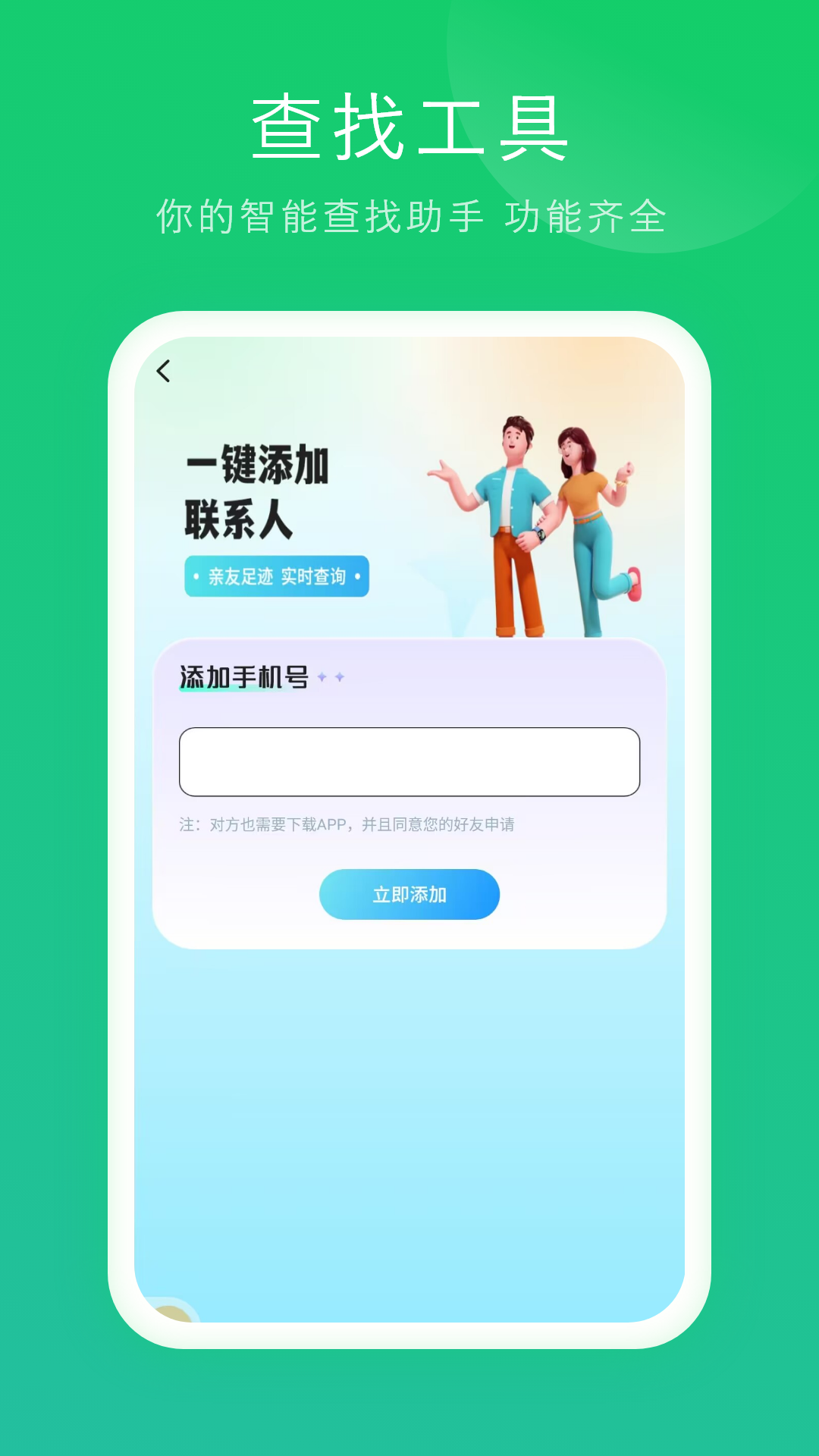 这是一款简易的手机位置查询工具,简洁方便。可以通过手机号查找对方账号(需对方安装并通过手机号登录),在对方授权后进行实时位置轨迹查看实时刷新变动,出行如遇险可以通过APP紧急呼叫求助。让您时刻了解到家人和朋友的位置,时刻保护家人和朋友的出行安全。