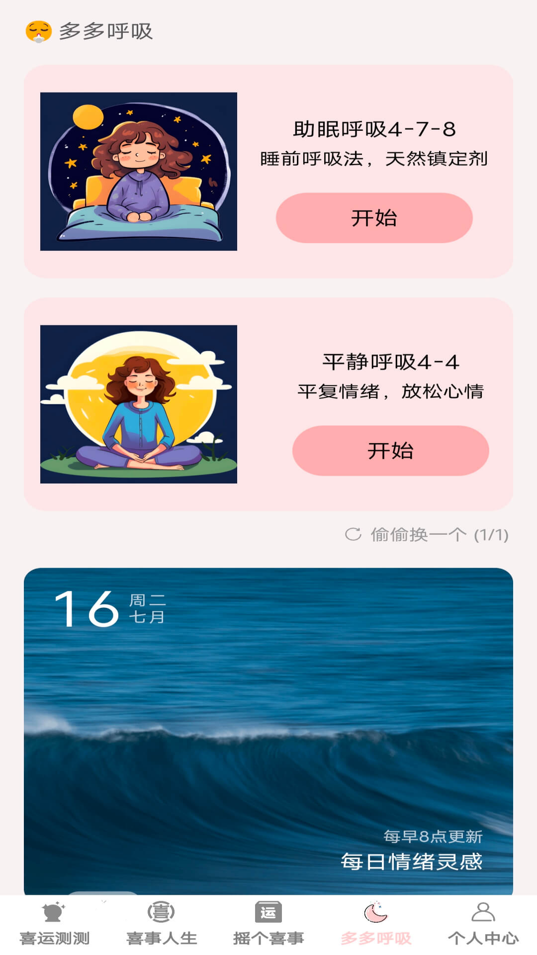 这里还有一个“良辰吉日”功能哦。不管是大事还是小事,它都能为你精心挑选出黄道吉日,让你做任何事都能有个好兆头,好运连连。更值得一提的是“摇个喜事”打卡,每天只要摇一摇,就能收获满满的正能量,就像开启了一个装满好运的魔法盒子。而且呀,多多呼吸助眠记录能够关注到你的身心健康,帮助你拥有良好的睡眠,让你晚上能一夜好梦,第二天醒来又是充满活力、元气满满的一天。