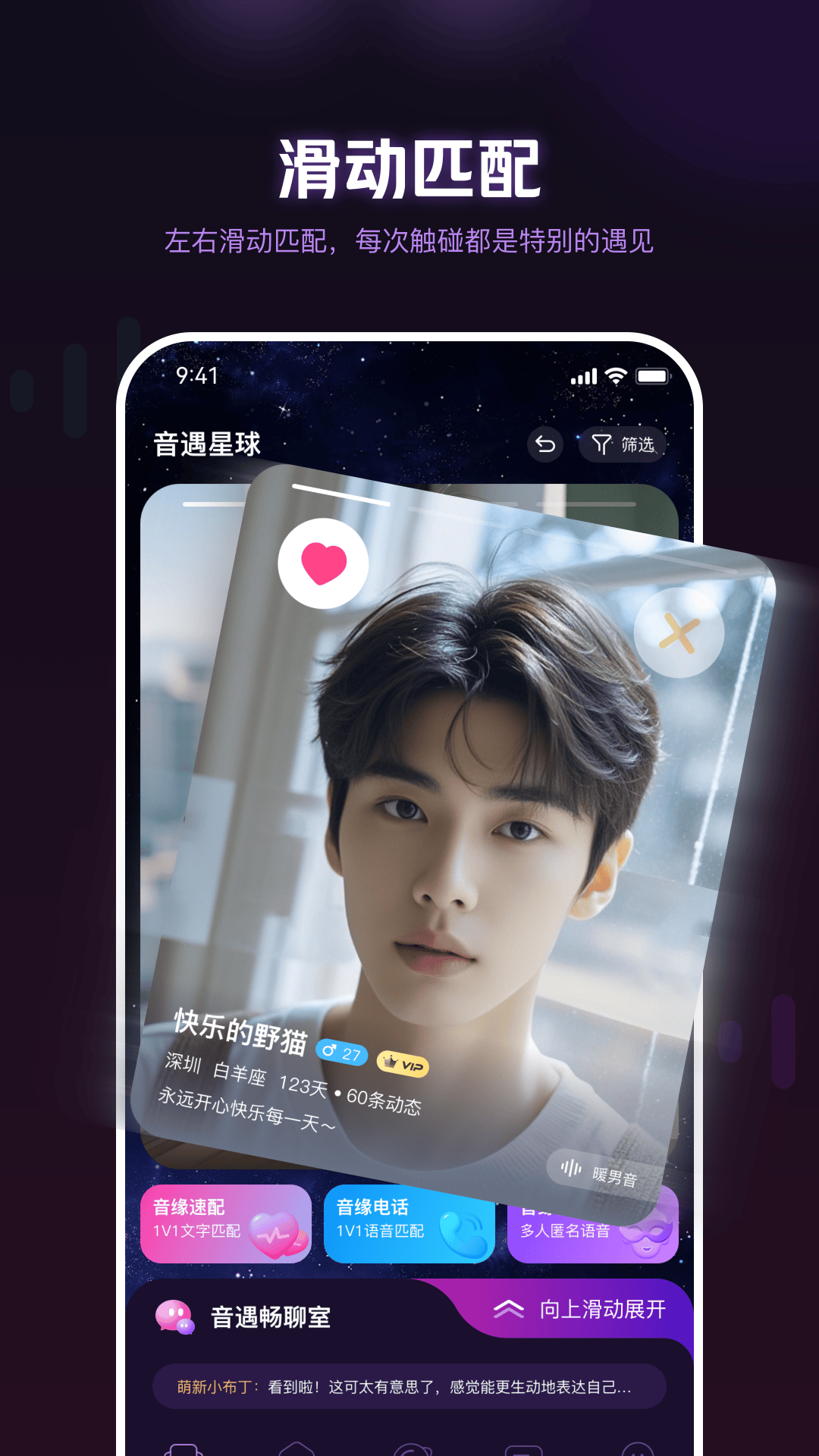 滑动匹配:只需轻轻滑动就能开启奇妙的音缘之旅。每一次滑动都像是开启一场充满惊喜的邂逅,要是不喜欢,轻松滑到下一位就好,缘分就在这不经意间触手可及;