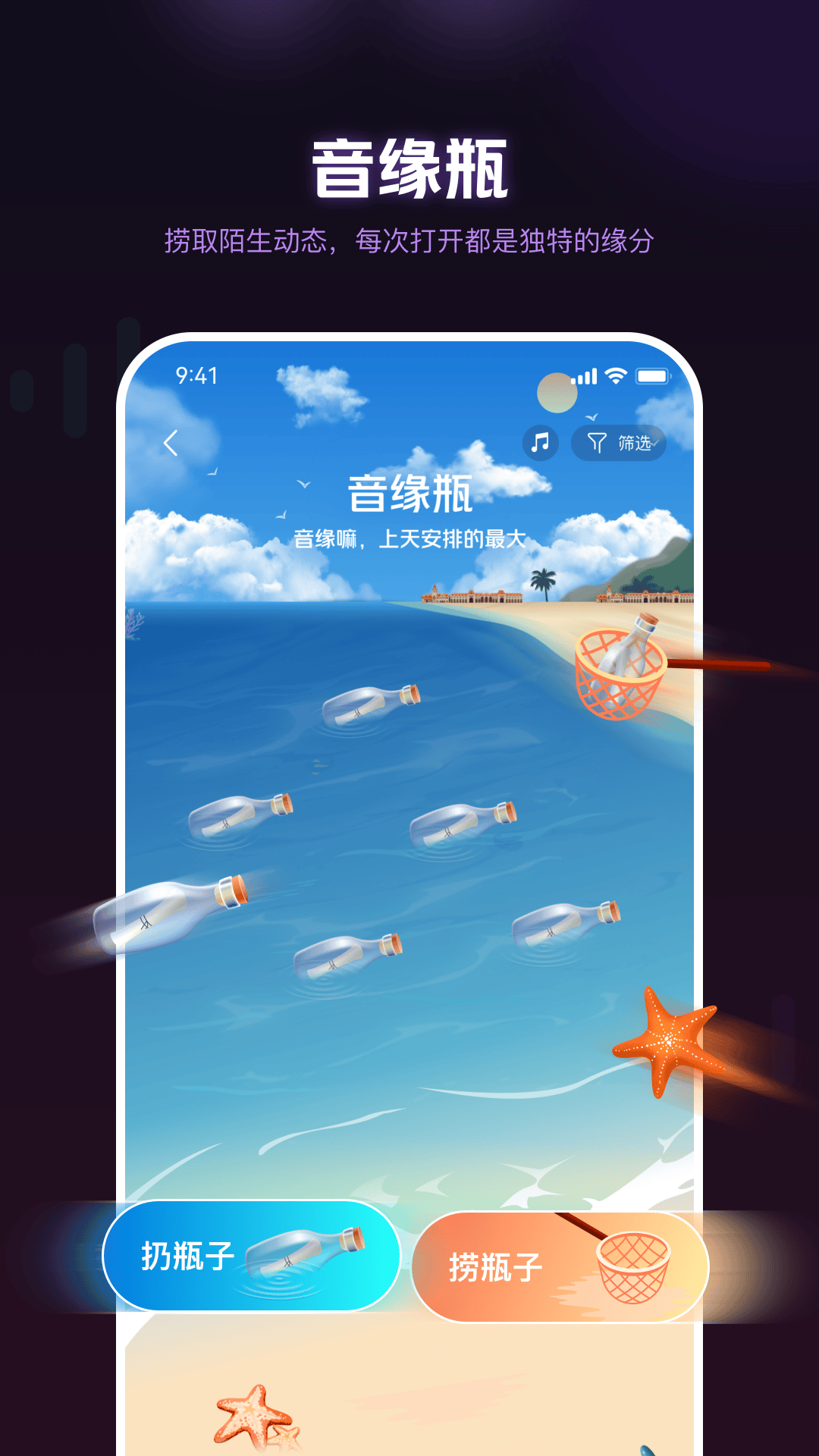 音缘瓶:捞取陌生人的动态,邂逅未知的感动,独特的缘分正等待着你去发现。