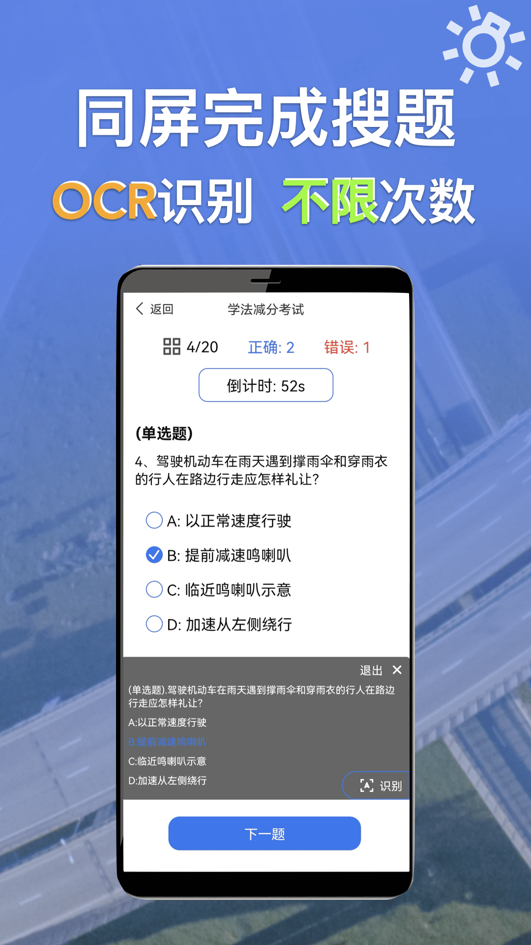 《学法减分识题》是一款智能题库检索应用,它具有诸多便捷功能,无需拍照,不用截图,就能在同一屏幕实现答题与搜题操作。