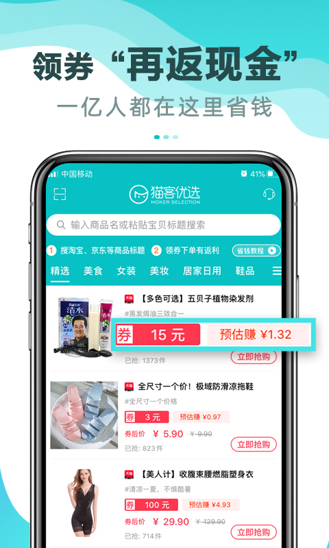 猫客优选官方APP,这里的商品都是精心挑选的,品质更优!它是一个拥有海量网购隐藏优惠券的搜索神器。在领券之后下单,还能享受返利优惠,这样可比直接购买便宜好多,有时候甚至能节省90%的费用呢。