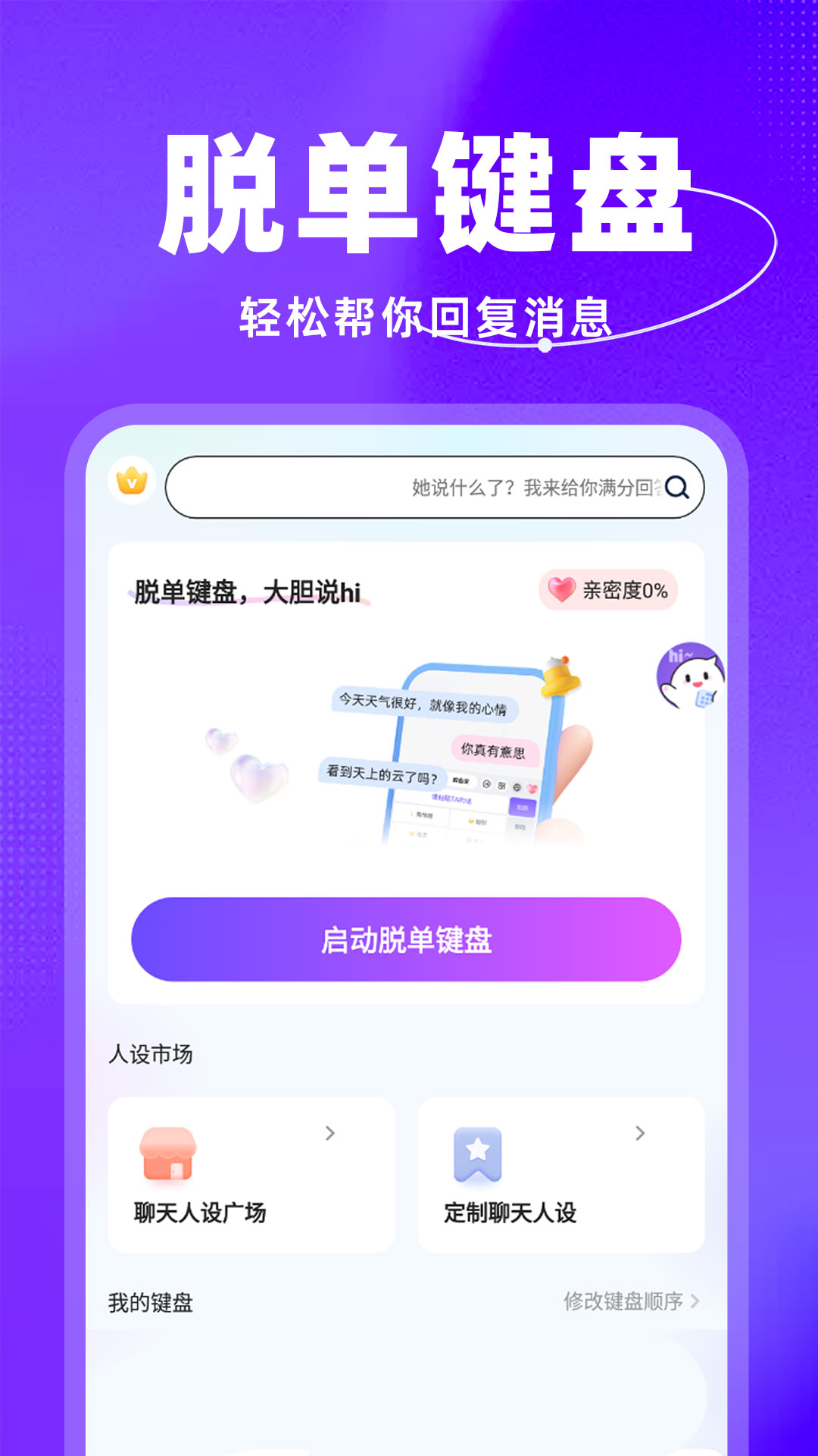 脱单键盘,更懂你的恋爱聊天输入法,帮你解决聊天尴尬,甜蜜互动,成功脱单。