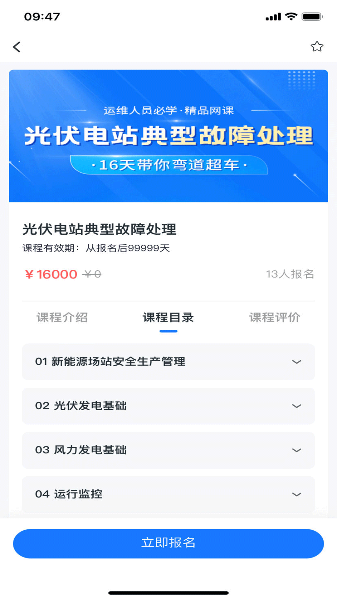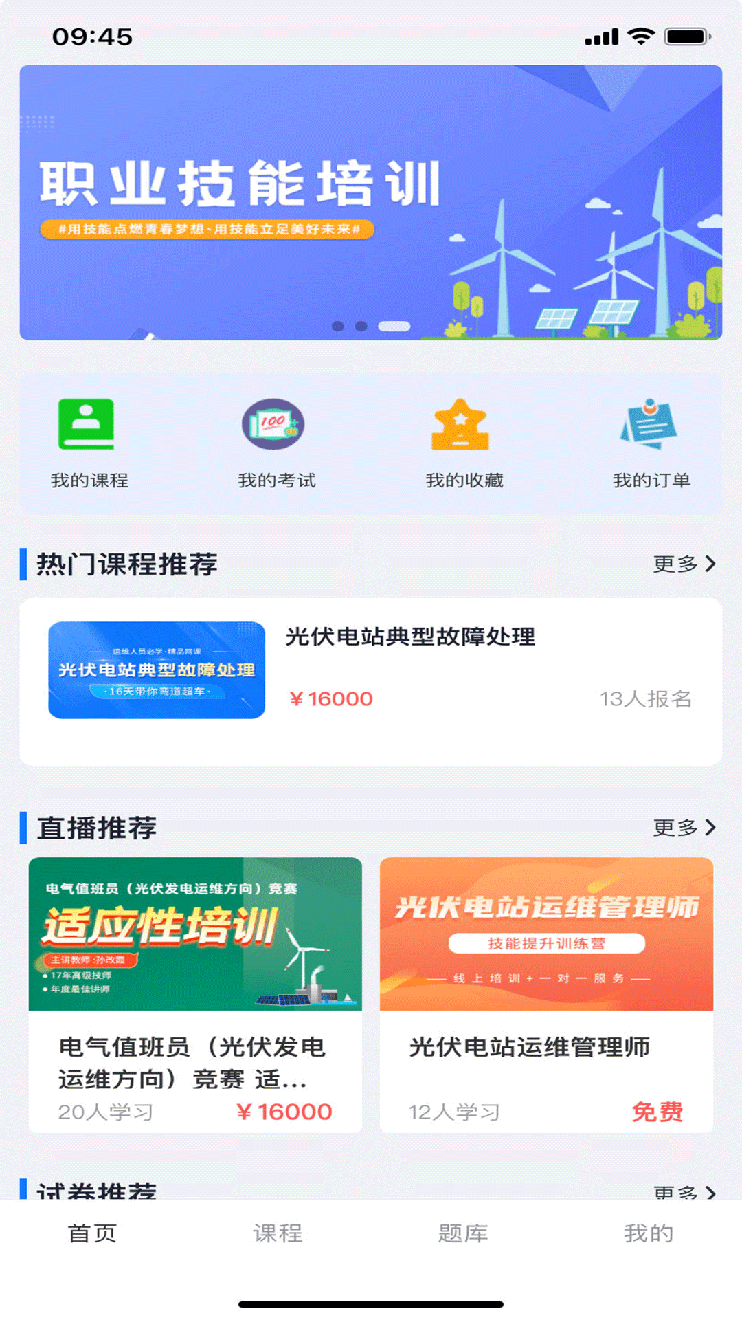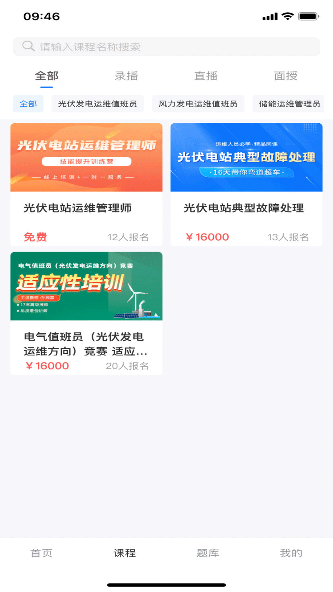 通过本APP学员可自主选择学习感兴趣的专业课程,支持多种教学模式包括:录播、直播专业课程学习,参加考试进行教学质量评估,帮助学员全面掌握光伏发电运维的原理、设备、技术、故障处理等专业知识和实践技能。