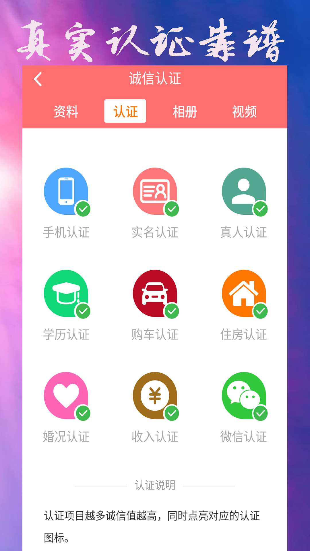 【防骗防托】具备全新的防骗防托功能,会提示对方是否已完成实名真人及人脸认证,为征婚安全保驾护航。