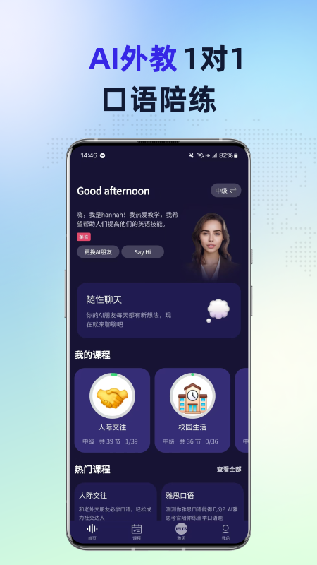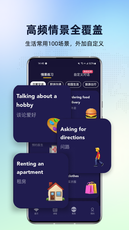 由资深外教精心设计的AI教学情景课,其场景全面覆盖生活、校园、旅游、职场等各个方面,采用对话式教学。丰富多样且充满趣味的对话任务,能让学习者满怀激情地逐步深入学习,从而告别社交恐惧下的哑巴英语,勇敢地开口表达。