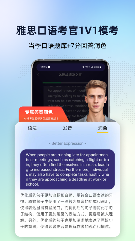 AI老师会严格依据雅思考试的标准与流程来为学习者出题、录音、打分以及进行分析,每次练习后都会提供一份评分报告!并且会根据学习者的表现给出具体的提升建议,像是怎样提高流利程度、准确度以及语法的复杂程度等。