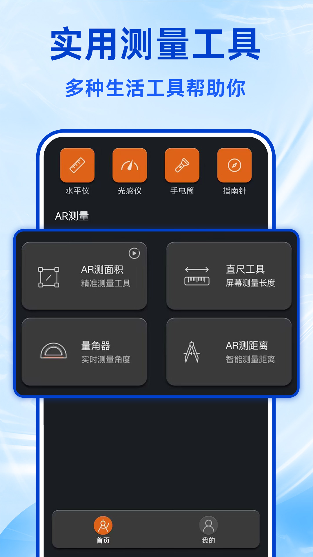 除了实时测距功能外,AR距离测量仪还具有水平仪、光感仪、手电筒、指南针、直尺工具、量角器等实用小工具。