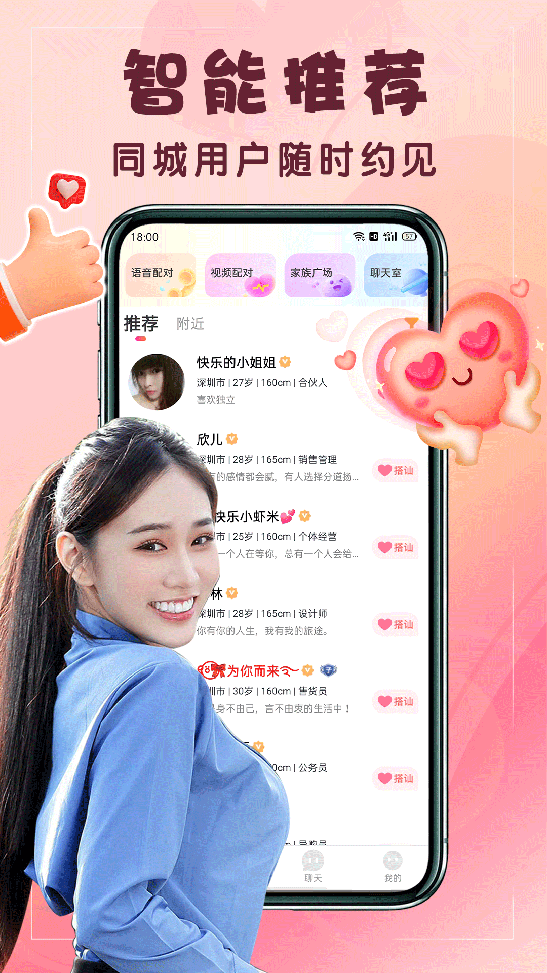 同城觅缘的交友约会非常自由,你可以在线上选择高颜值的妹子,线上尽情交友聊天,然后线下见面约会,带你走进成年人的交友空间。快来探寻附近有趣的灵魂,找个伴,马上告别单身生活吧。