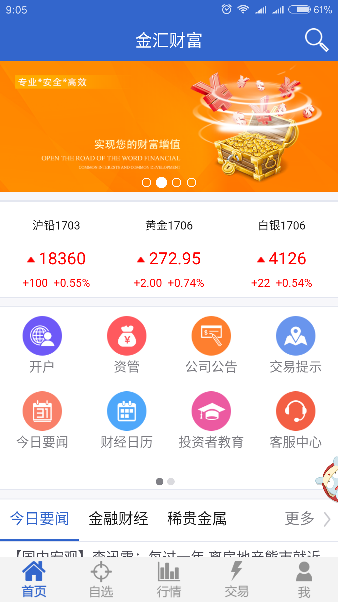 金汇财富,一款集资讯、交易、行情、开户于一体的手机APP程序,可以帮助您更快更早的掌握财经资讯,更快的进行期货下单。本APP支持中金所、上期所、郑商所、大商所四个期货交易所上市期货品种的行情、交易功能,更集策略研究报告、投资者者服务、财经日历等常用、实用功能于一体,让您在期货市场快人一步。