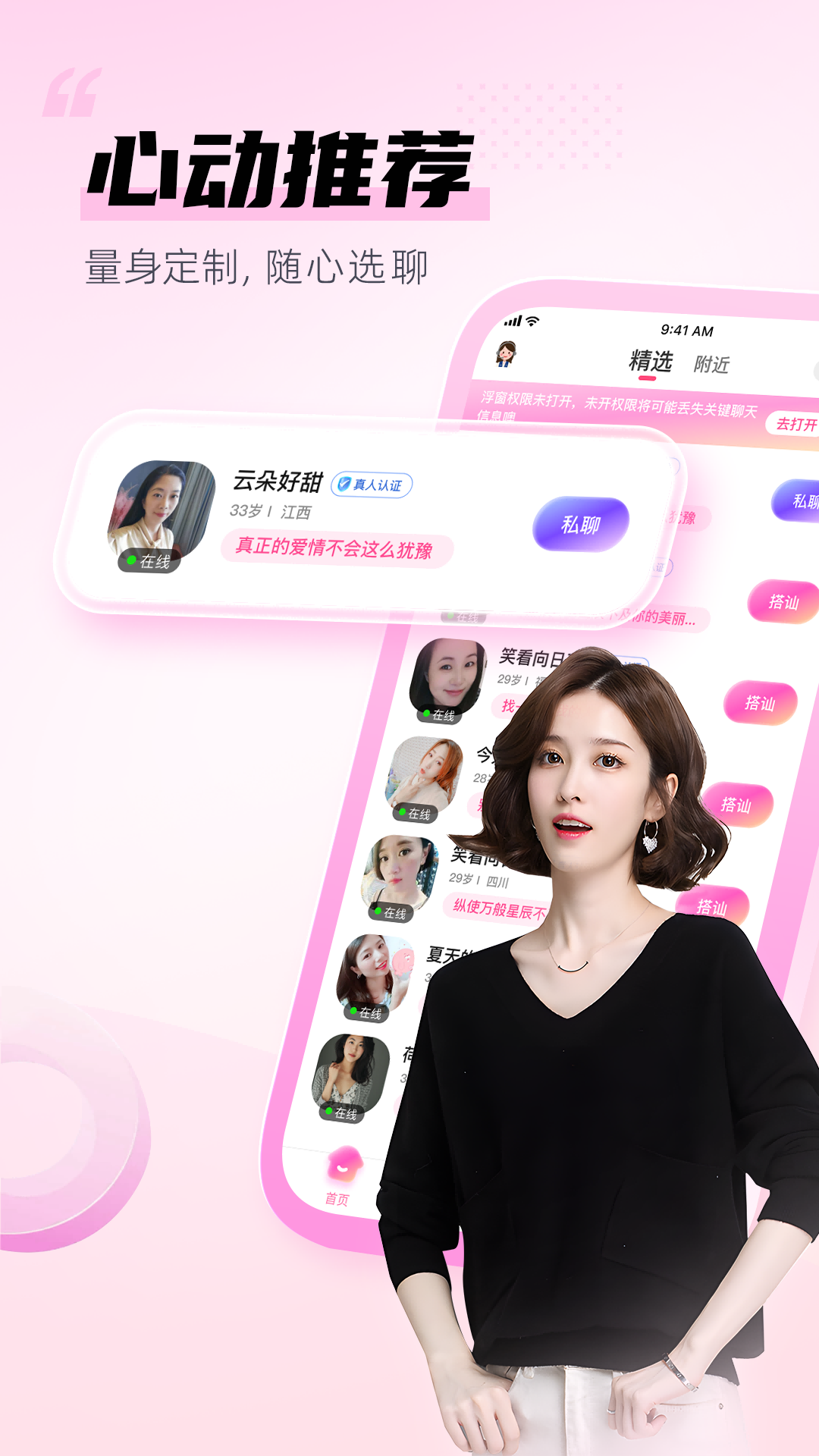同城交友,单身交友,附近交友,互动聊天等功能,精心为你挑选出让你心动的TA。