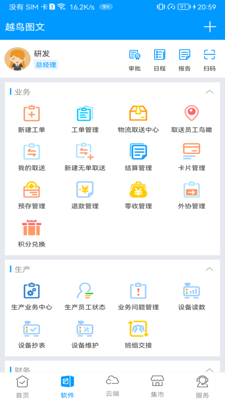 印特移动管理软件的无线端为印特管理软件移动版,它包含待办、软件、云端、比印集市这四大管理模块。