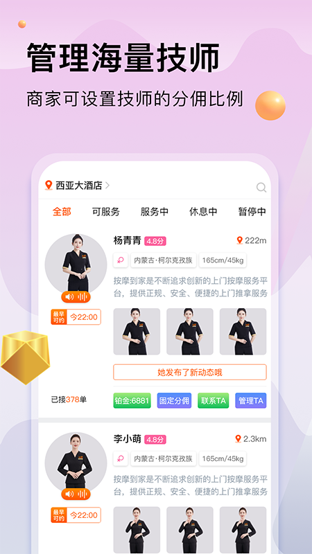 按摩到家商家版APP是一个为按摩店打造的经营服务平台,专注于上门接单服务以及技师在线接单管理。在这个平台上,技师无需坐班。他们能够通过实时定位功能,选取自己所在城市附近的订单,然后免费接活,如此便可轻松实现线上办公,便捷地获取客户,还能对订单收益进行掌控,同时掌握员工上门按摩服务的进展情况。