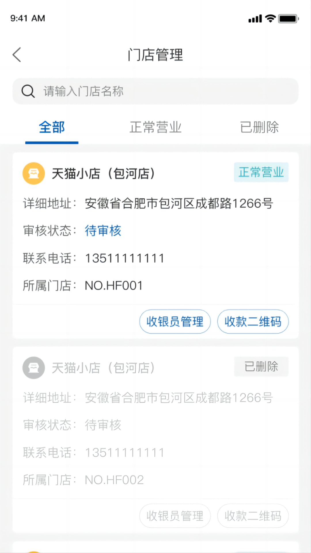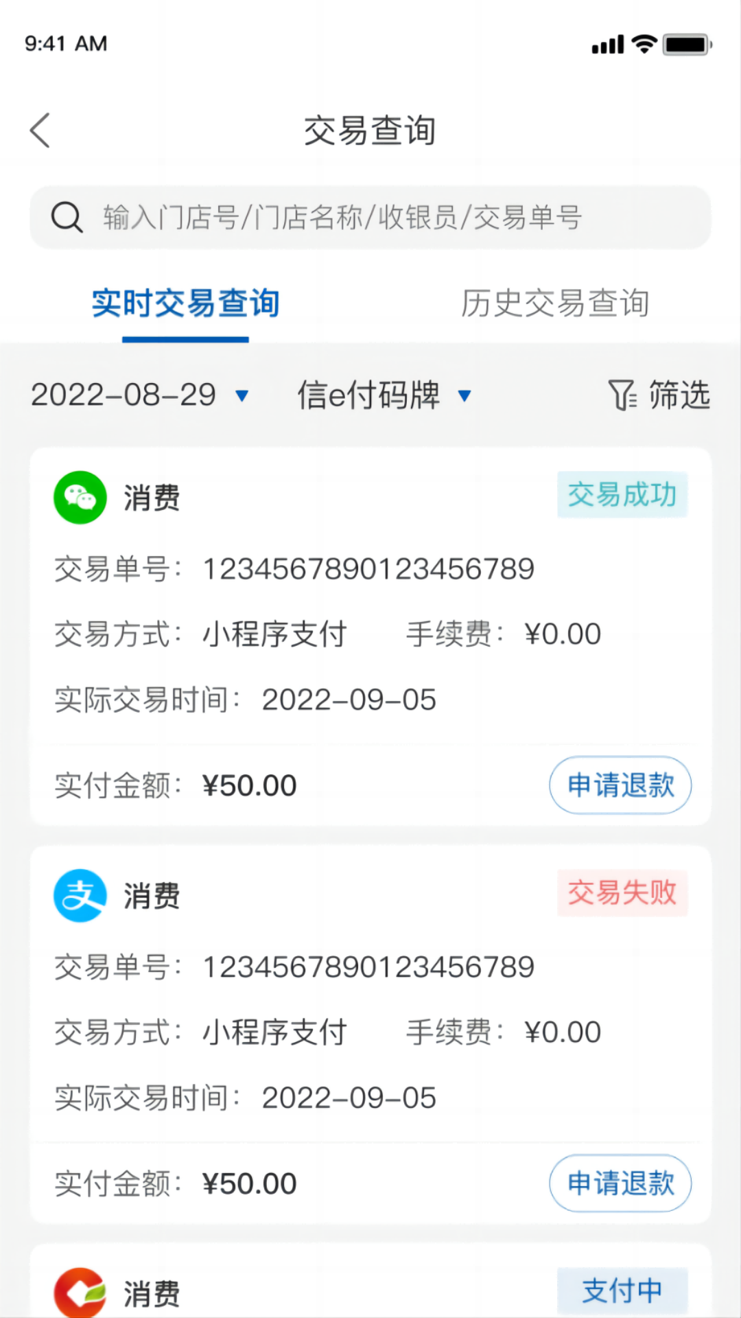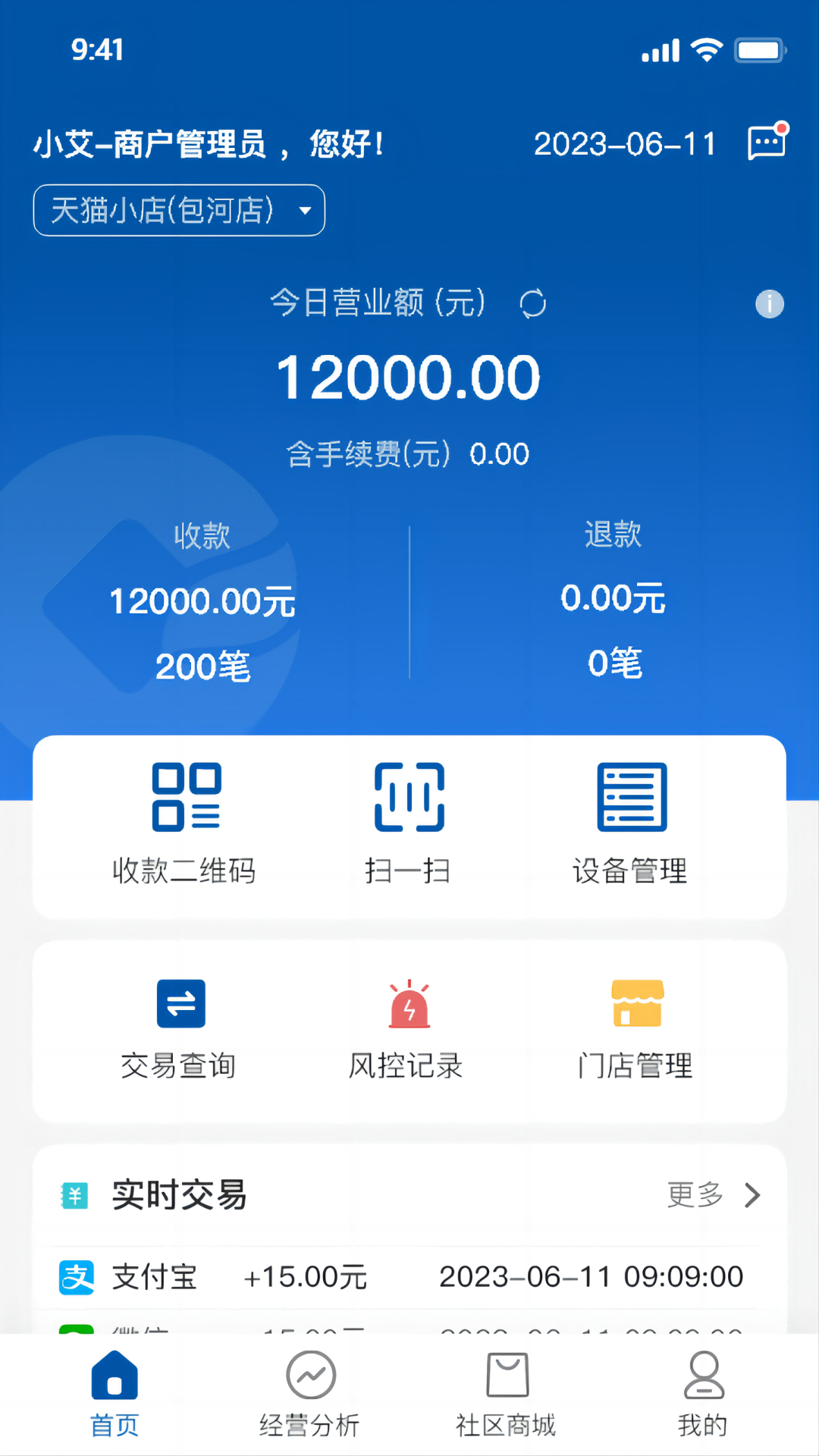 【首页】支持商户展示收款二维码和进行扫码收款交易、信e生活商城团购二维码核销交易,查询当日营业情况,管理门店设备,查询交易记录。